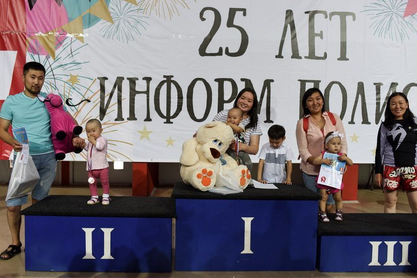 – Нашему сыну Алдару 8 месяцев, готовились мы с ним дома конкретно, тренировались, ползали. В качестве стимула у нас припасены мышка от компьютера и светящиеся динамики, – рассказывает папа Буянто, пока его супруга менеджер «Бест Плюс» Лариса готовит ребенка к старту и рассказывает другим родителям о выгодных предложениях.