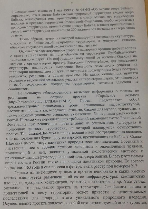 - Мы, участники движения «За священный Байкал» и неравнодушные граждане России заявляем, что эти проекты не имеют ничего общего с традиционными ценностями и верованиями народов, проживающих на Байкале. На наш взгляд, они лишь оскверняют священное имя Байкала, оскорбляют религиозные чувства местных жителей и могут нанести непоправимый вред уникальной экосистеме Ольхона, – отмечается в письме. – Не проводя широкого общественного обсуждения и прикрываясь культурными ценностями и красивыми лозунгами о защите природы, организаторы проектов рассчитывают лишь на извлечение прибыли от их реализации и получение государственных грантов.