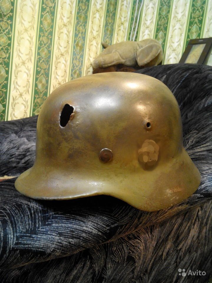 «Оригинальный шлем М35, не гнилой, восстановлен, краска по каталогу, подшлемник и подбородник копии оригинала. Искусственно состарен, имеет бывалый вид, оригинальный сквозной прострел. Согласно закону РФ, не является пропагандой, только для частной коллекции на вашу полку» - пишет автор объявления.