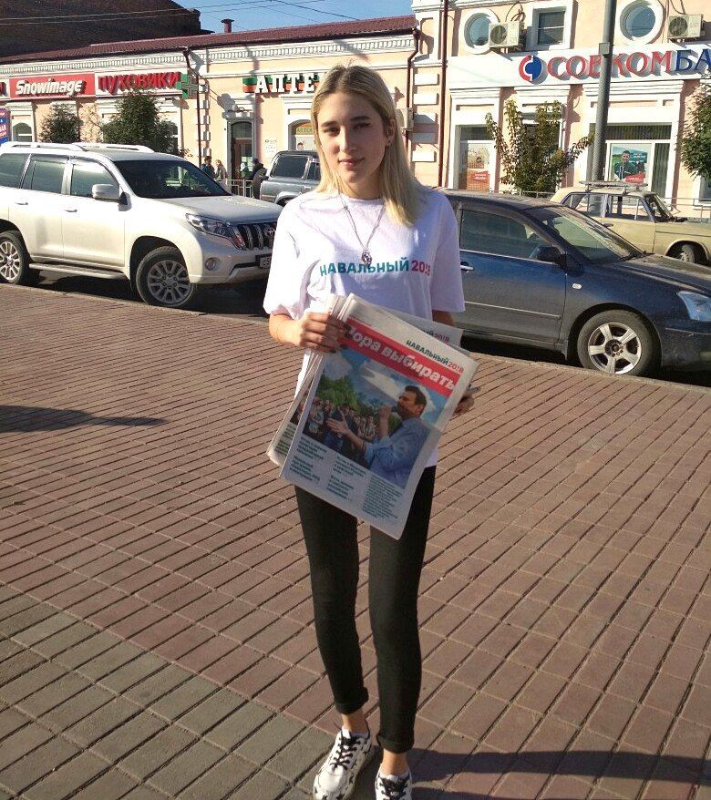 Рядом вели агитацию четыре волонтёра – они раздавали проходящим мимо горожанам листовки с изображением своего лидера и газеты. Упоминается в них и о нашумевшем фильме-расследовании «Он вам не Димон!».