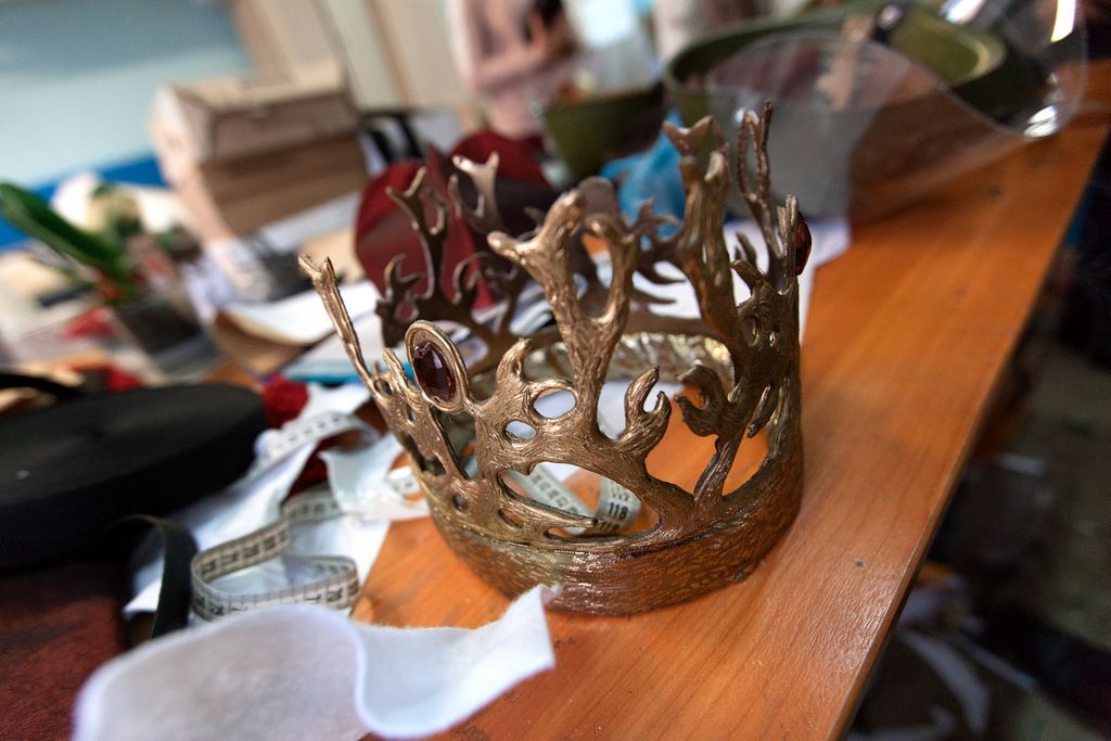 «Работы очень много в этом спектакле. Самое сложное - это «туши», их слишком много. И много мелочей, мелких деталей. Эту корону делала моя сестра. Сложновато, конечно, но интересно. Нам же надо придумать, как все это будет выглядеть, из чего состоять, как будет работать на сцене...»