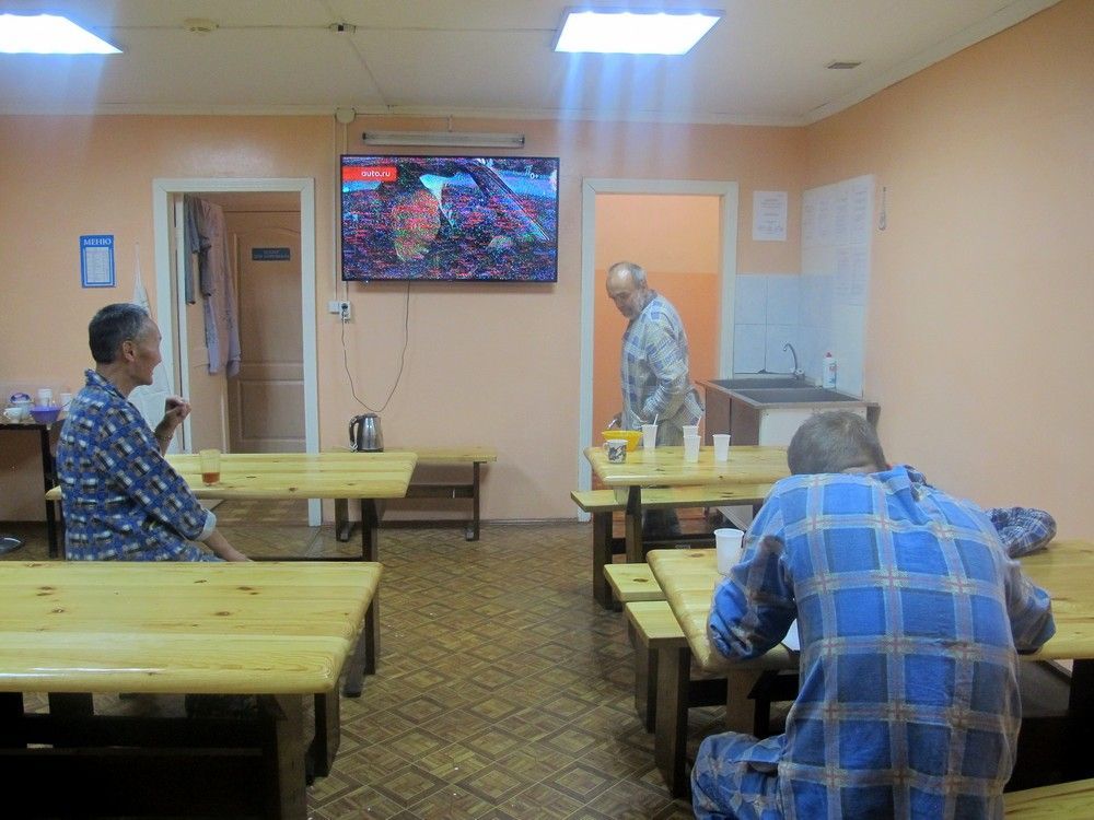 Рейд наш завершился в республиканском центре «Шанс». Мы пришли туда к семи, когда около двадцати мужчин, уже переодевшись, сидели у телевизоров и ждали ужина. Его привезли ближе к восьми. В столовой, как мы поняли, установлено дежурство. Один мужчина разливал суп по пластмассовым тарелкам. Кто-то резал хлеб, третий раскладывал ложки.