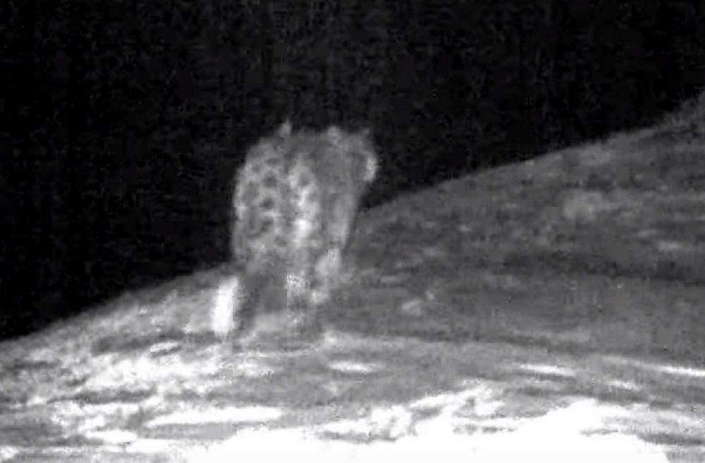 Ирбис запечатлен камерами в сумерках со спины, хорошо виден роскошный хвост хищника. Темное время суток – период, когда ирбис наиболее активен. Зверь охотится, передвигается, поэтому фотоловушки часто «ловят» редкого хищника именно в темноте.