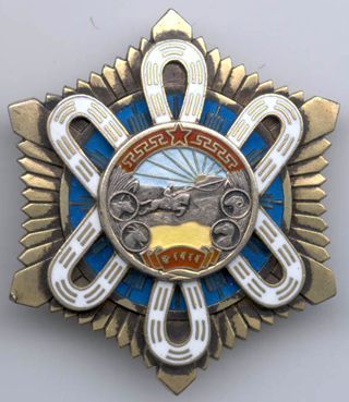По внешнему краю знака расположен расширяющийся книзу золотой бордюр в виде рельефных лучей. На середину наложена красная пятиконечная звезда. В трех нижних углах звезды лучи солнца, в двух верхних – древки красных знамен. На звезду наложен герб «Соёмбо». На каждом знамени изображены по два слога (старого монгольского алфавита, покрытые белой эмалью (и еще одна буква находится на центральном луче в нижнем углу). Эти буквы являются сокращением слов: Бугд, Наирамдах, Монгол, Ард, Улс, что в переводе означает «Монгольская Народная Республика».
