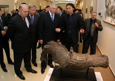 На фото Марка Агнора вверху: Во время открытия выставки Даши Намдакова в Улан-Удэ в феврале этого года мэр Улан-Удэ Геннадий Айдаев попросил у президента Бурятии денег на установку в столице республики работы известного скульптора. Вячеслав Наговицын в ответ только улыбнулся