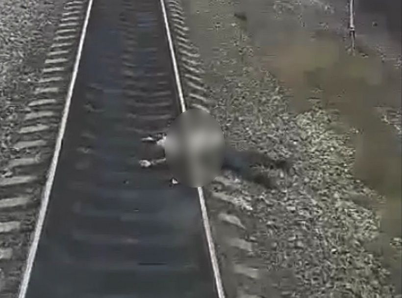 В интернете появилось видео шокирующего случая, где видно как тело мужчины лежит на путях, при чем с одной стороны рельс оказалась голова и часть туловища, а с другой - ноги.