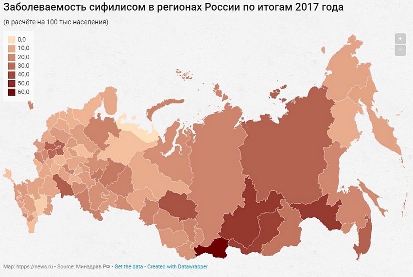Между тем в Ненецком автономном округе в 2017 году не было зафиксировано ни одного заболевшего сифилисом. Низкие показатели по заболеваемости также в Калмыкии (2,5 случая на 100 тысяч населения), Республике Коми (4,4 случая на 100 тысяч человек).