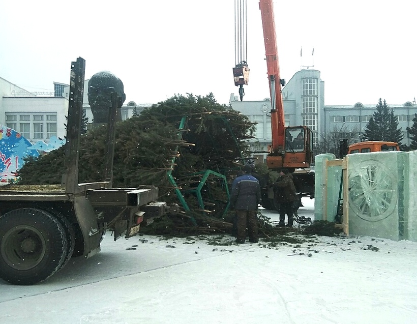 Но зелёная красавица не простояла в центре города и месяц – накануне её демонтировали. Один из посетителей популярного паблика «Аноним 03» «ВКонтакте» запечатлел на камеру, как целая бригада рабочих разбирает ёлку с помощью крана и грузит в машину.