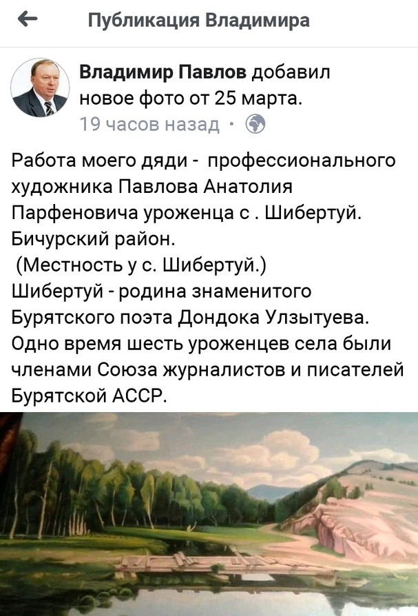 Владимир Павлов, который с сентября возглавляет республиканский парламент, опубликовал в соцсетях картину, написанную его дядей – Анатолием Парфеновичем Павловым. Спикер Народного Хурала рассказал, что на ней изображена местность около бичурского улуса Шибертуй.