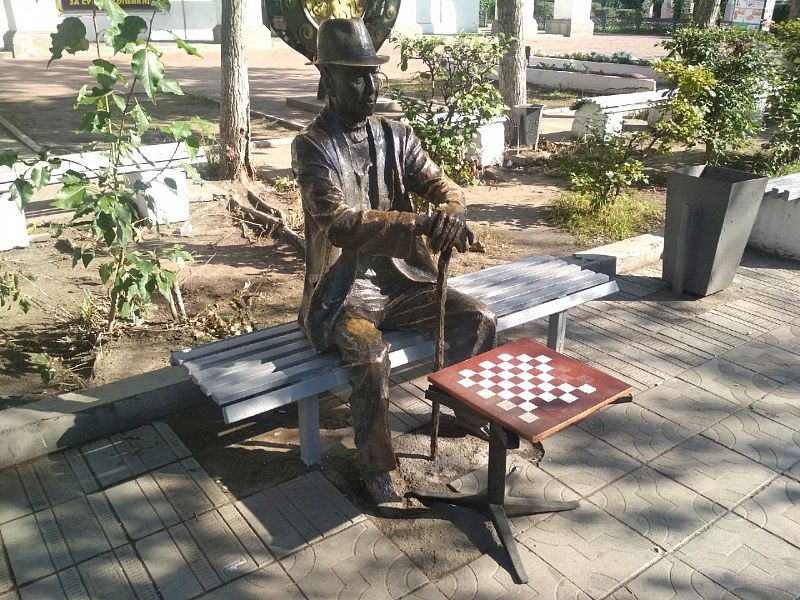 Недавно скульптуру наконец-то «подвеселили» – с ногами у бронзового пенсионера теперь всё в порядке. А ещё напротив него поставили небольшой шахматный столик.
