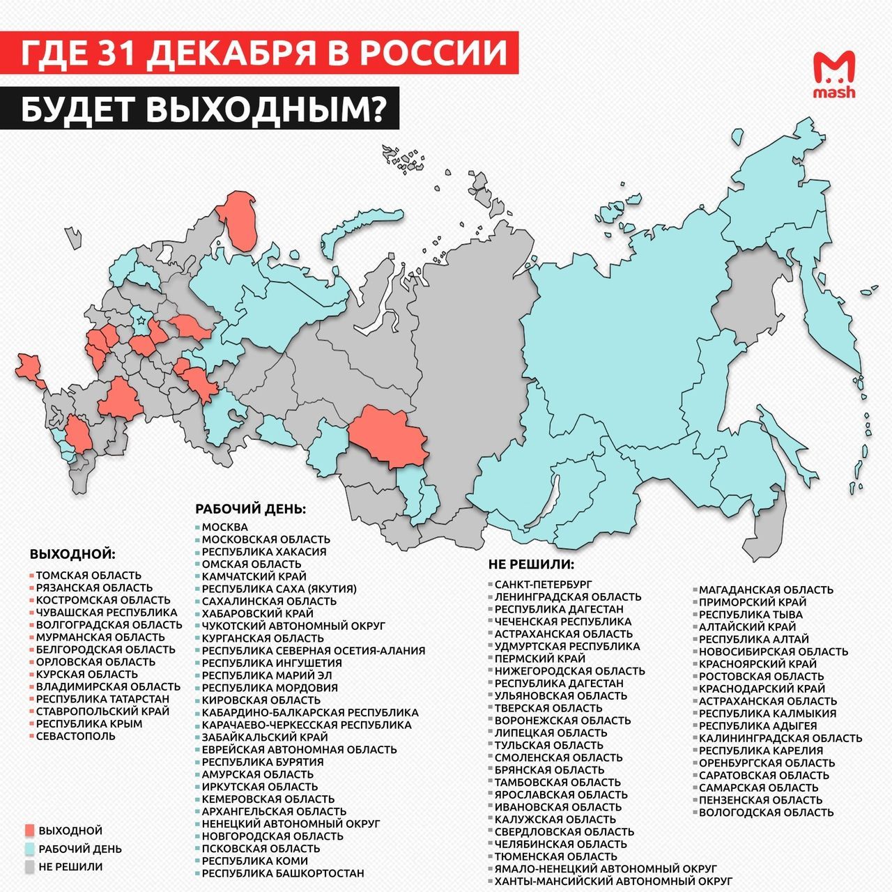 В популярном паблике «Mash» во «ВКонтакте» разместили карту регионов, которые будут отдыхать 31 декабря. Всего их в списке 14 – это Томская, Рязанская, Костромская, Волгоградская, Мурманская, Белгородская, Орловская, Курская, Владимирская области, Чувашия, Татарстан, Ставропольский край, Крым и Севастополь.