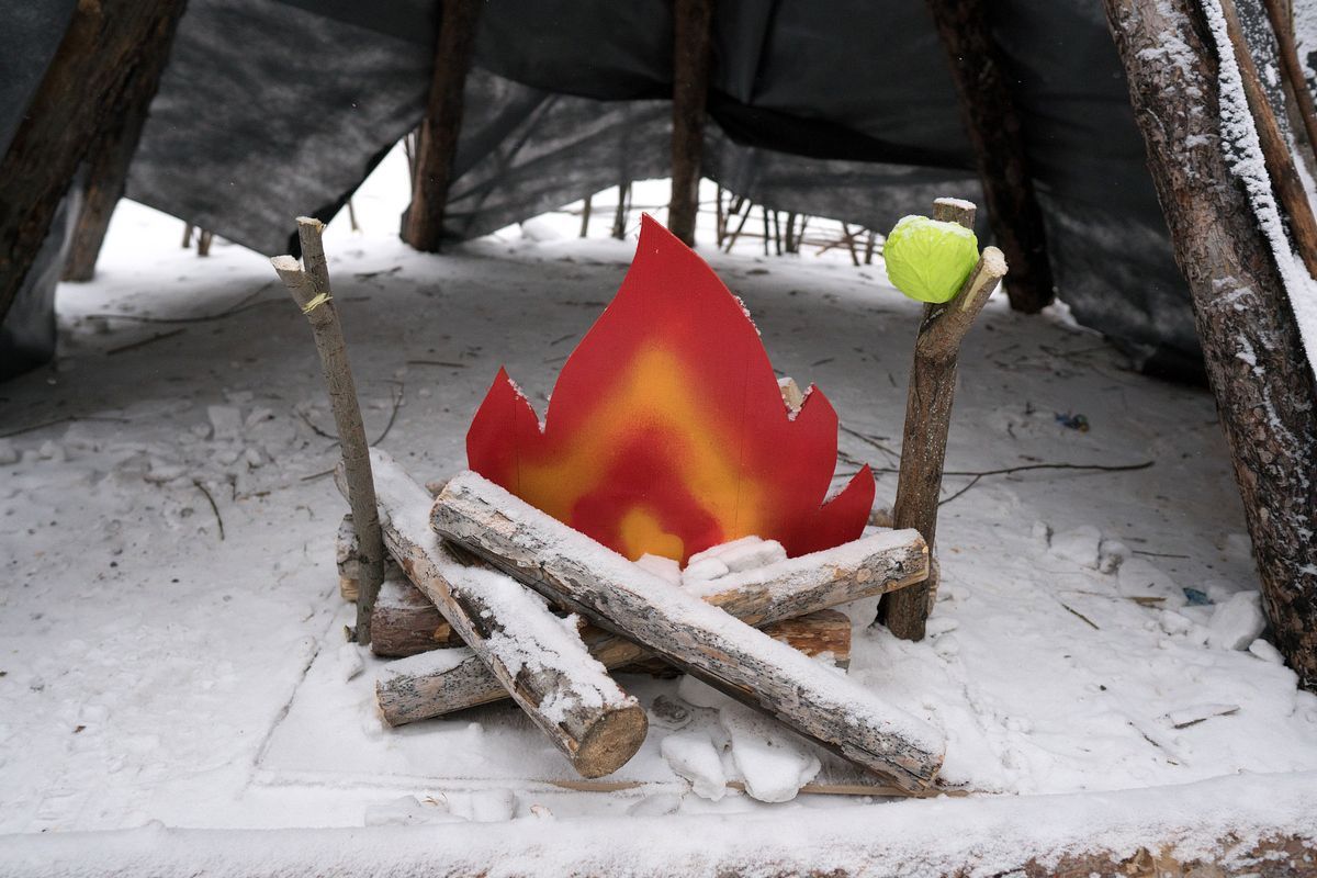 Судя по фото, на детской площадке соорудили частокол с коровьими черепами и шкурами животных, установили «снеговиков» из дерева с масками в виде черепов и построили шалаш, внутри которого на вертеле были мыши и овощи.