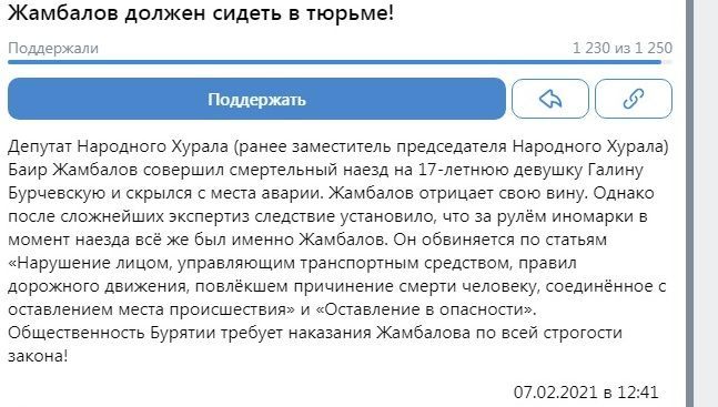 Несколько недель назад в бурятском сегменте во «ВКонтакте» появилась группа под названием «Против Жамбалова». Речь идёт о бывшем вице-спикере Народного Хурала Бурятии Баире Жамбалове – его обвиняют в смертельном ДТП, в котором год назад погибла 17-летняя Галя Бурчевская.