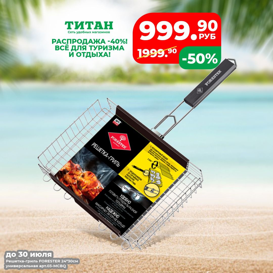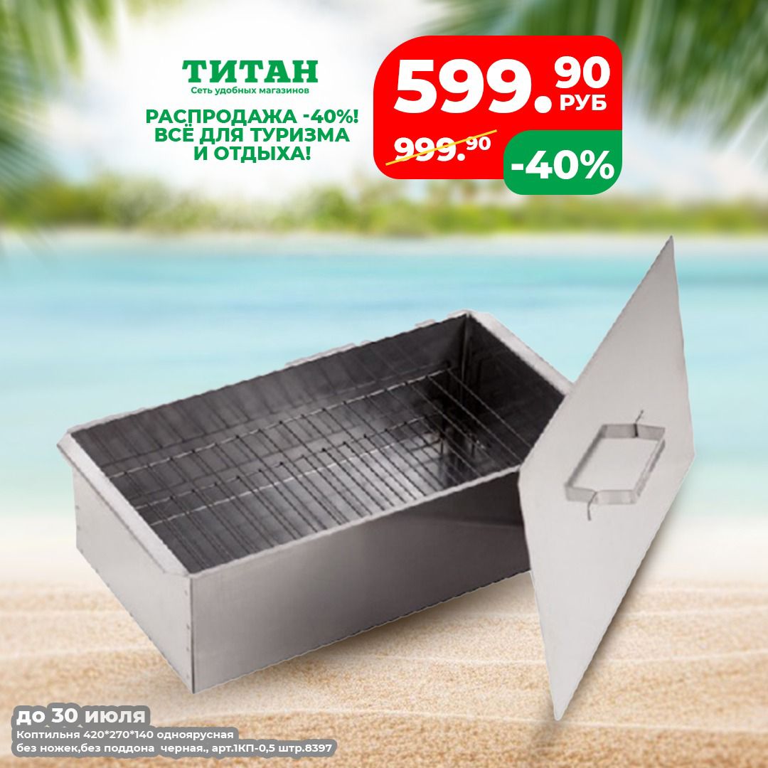А решетки, коптильни и наборы из туристической серии до 30 июля идут со скидкой до 40%! Кстати, на полках «Титана» вы найдете все необходимое для отдыха: пледы, термокружки, средства личной гигиены и, конечно, продукты. Так что последним пунктом в наш чек-лист заносим – «Заехать в «Титан»!