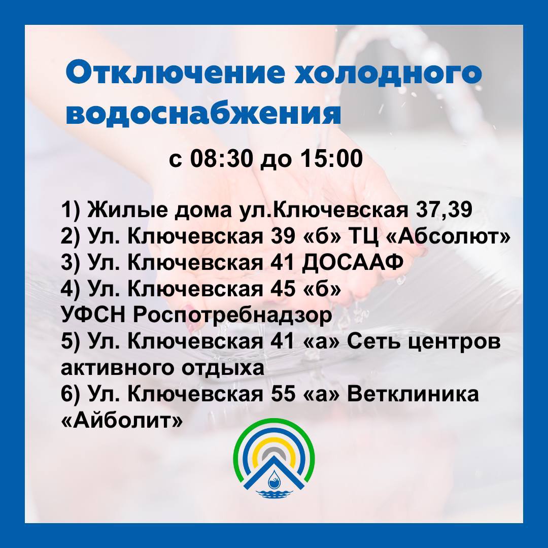 В среду, 21 сентября, жилые дома № 37 и 39 на улице Ключевская, а также здания ДОСААФ и Роспотребнадзора и ветеринарная клиника «Айболит» остались без холодной воды. Об этом сообщили в МУП «Водоканал».