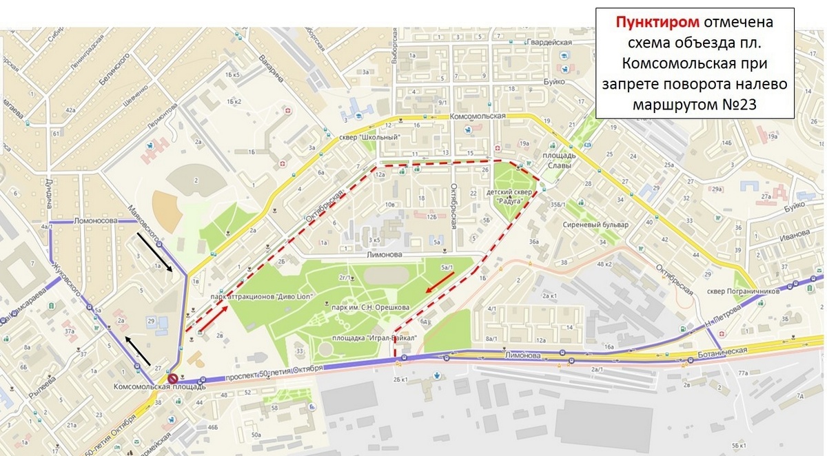 У маршрута №23 при движении в направлении мкр. Восточный из пути следования будет исключена остановка «Площадь Комсомольская» в районе Железнодорожного колледжа. Объезд закрытого участка будет по ул. Октябрьская с выходом на остановку «Проходная ЛВРЗ». В направлении центра города движение автобусов маршрута №23 останется без изменений.