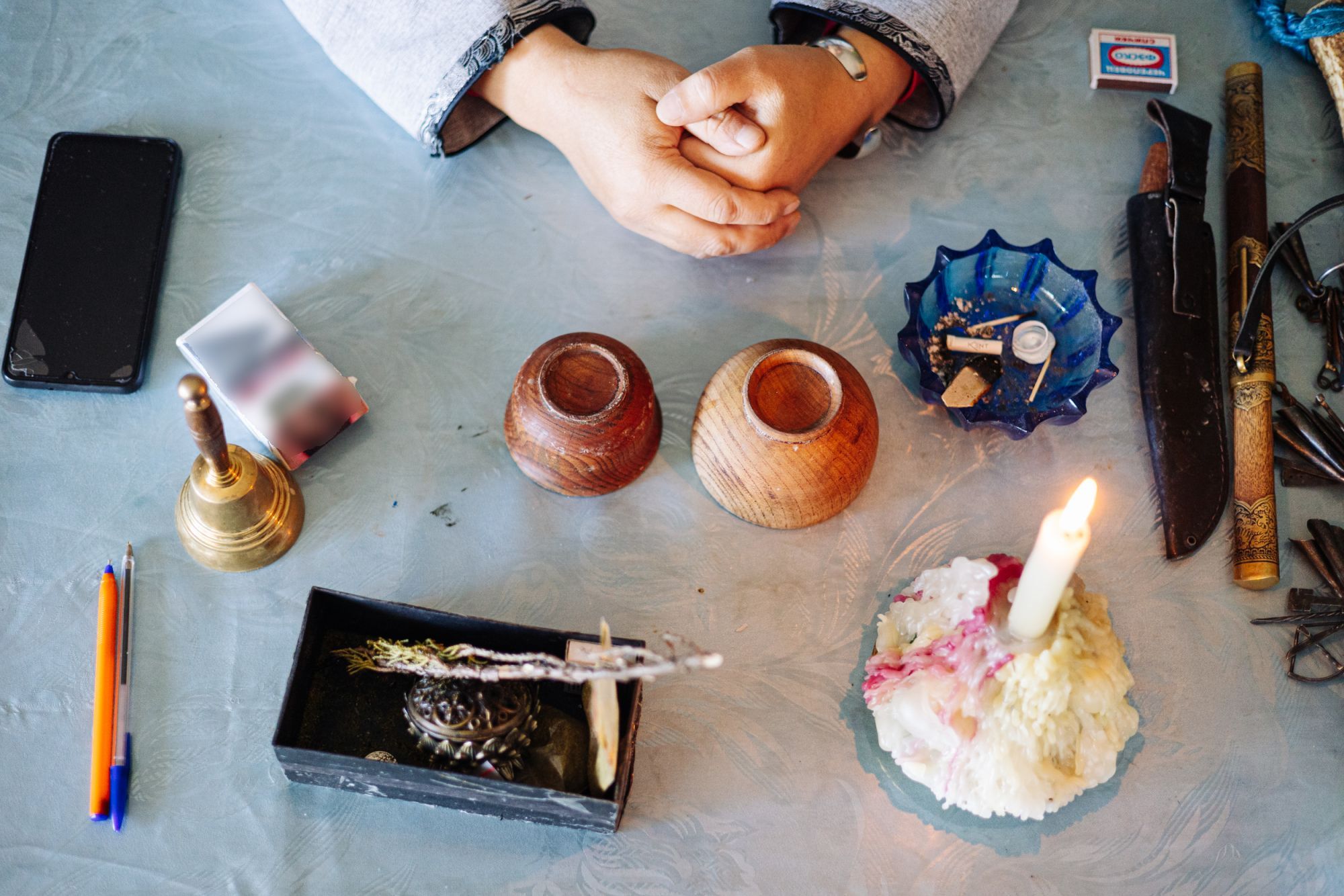 На столе, за которым Игорь Александрович принимает гостей, ничего лишнего – только атрибуты, необходимые для работы: зажженная свеча, две маленькие чаши, колокольчик, два ножа. Сам шаман, в отличие от стереотипов, облачён в ничем не примечательную одежду.