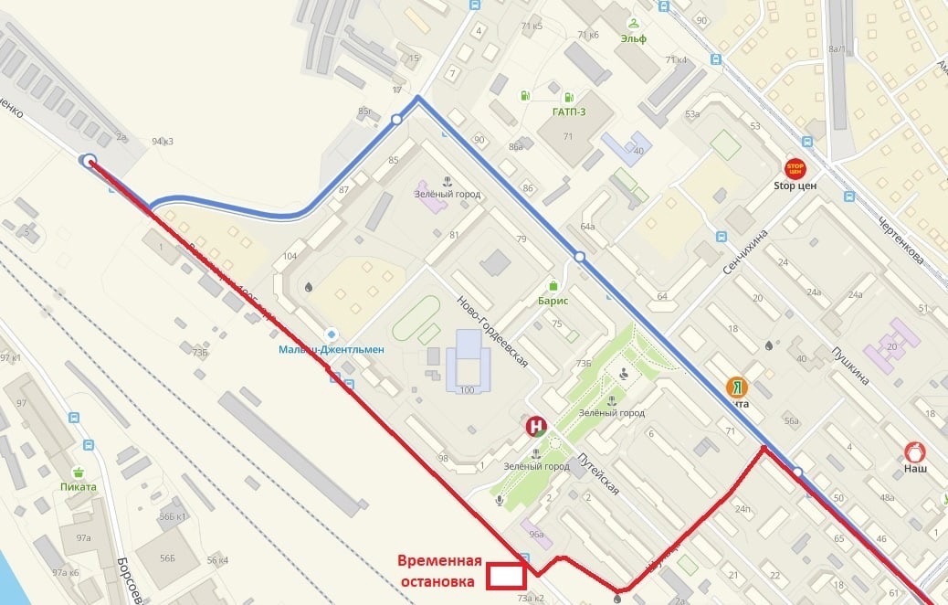 По этой причине движение автобусов №56 в объезд закрытого участка по улице Гагарина и улица Коллективная будет осуществляться через улицы Щульца и Революции 1905 года. При этом на пересечении этих улиц в направлении центра города организован временный остановочный пункт.