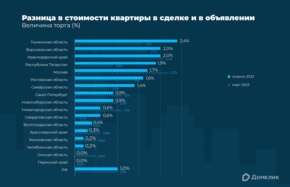Наибольшие значения скидок среди крупнейших регионов отмечаются в Тюменской области (2,4%), Воронежской области (2%) и Краснодарском крае (2%), где величина уступки в два с лишним раза больше, чем в среднем по стране. В Москве скидка также высока — 1,7%.