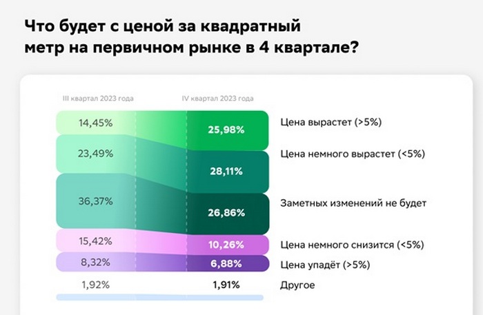 Доля экспертов, прогнозирующих падение цен, изменилась менее существенно: сейчас процент составляет 23,74 против 17,14% кварталом ранее.