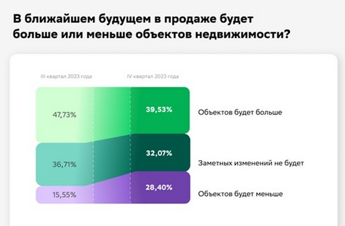 Домклик провёл всероссийский опрос среди 1,8 тыс. риелторов о перспективах рынка жилой недвижимости в IV квартале 2023 года. Эксперты ответили на вопросы о динамике спроса и предложения, а также о стоимости жилья. Результаты опроса показали, что каждый второй эксперт ожидает охлаждения рынка в ближайшие месяцы: около 50% опрошенных уверены в скором снижении количества сделок. Треть опрошенных прогнозирует снижение покупательской активности более, чем на 5%.