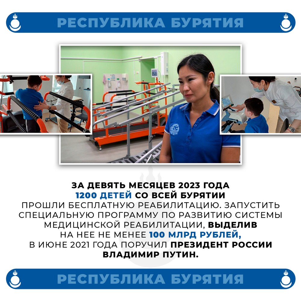 В трех отделениях Детской республиканской клинической больницы за девять месяцев 2023 года 1200 детей со всей Бурятии прошли бесплатную реабилитацию. Запустить специальную программу по развитию системы медицинской реабилитации, выделив на нее не менее 100 млрд рублей, в июне 2021 года поручил Президент России Владимир Путин.