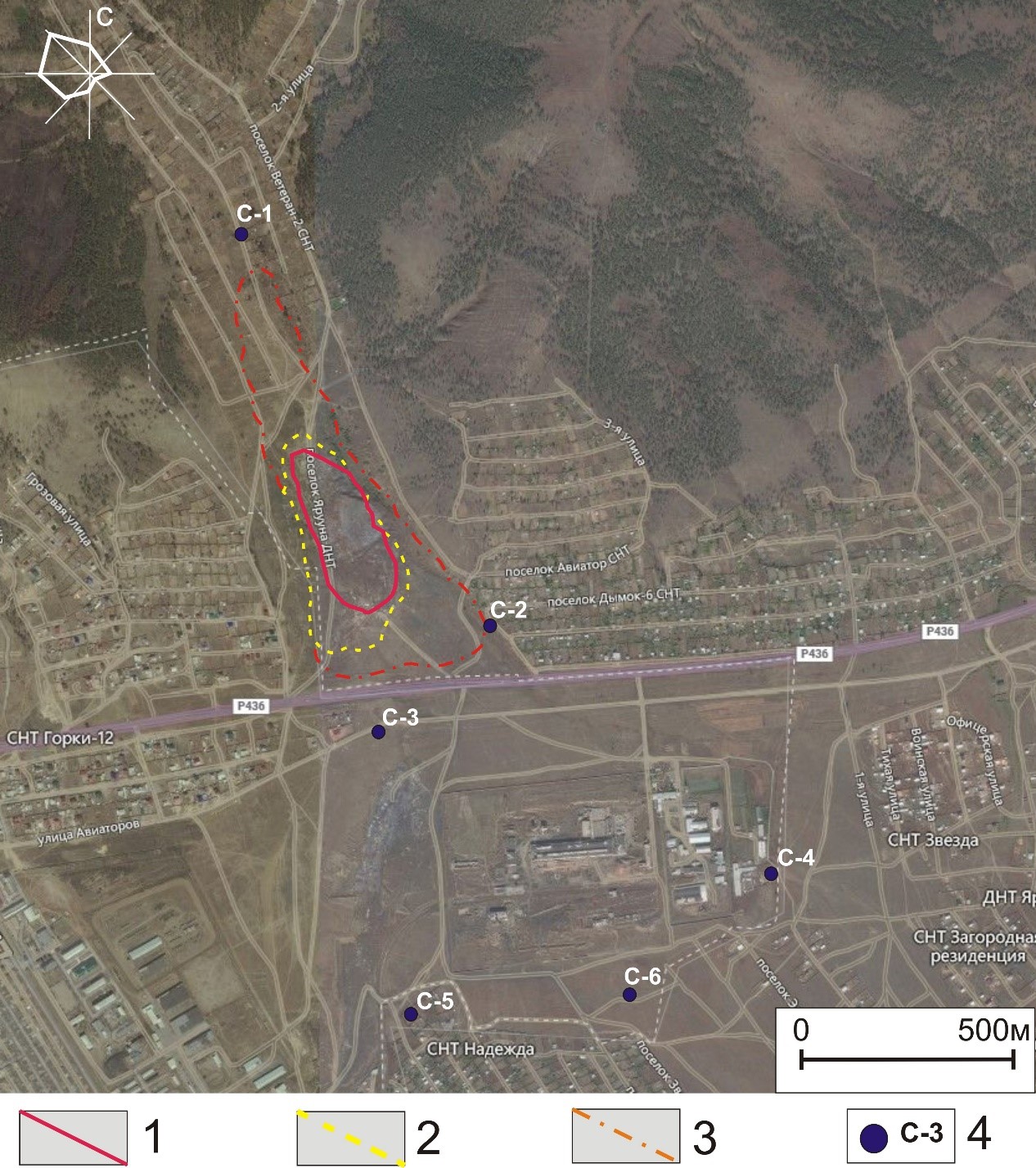 Ситуационная схема расположения свалки п. Бабасанова. 1 – условная граница свалки; 2 – граница основного тела свалки (по данным 1992 г); 3 – фланги свалки (по данным 1992 г); 4 – мониторинговые скважины (по данным 1992 г)