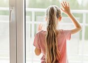 Мальчик облокотился на москитную сетку, пока его мама была в другой комнате