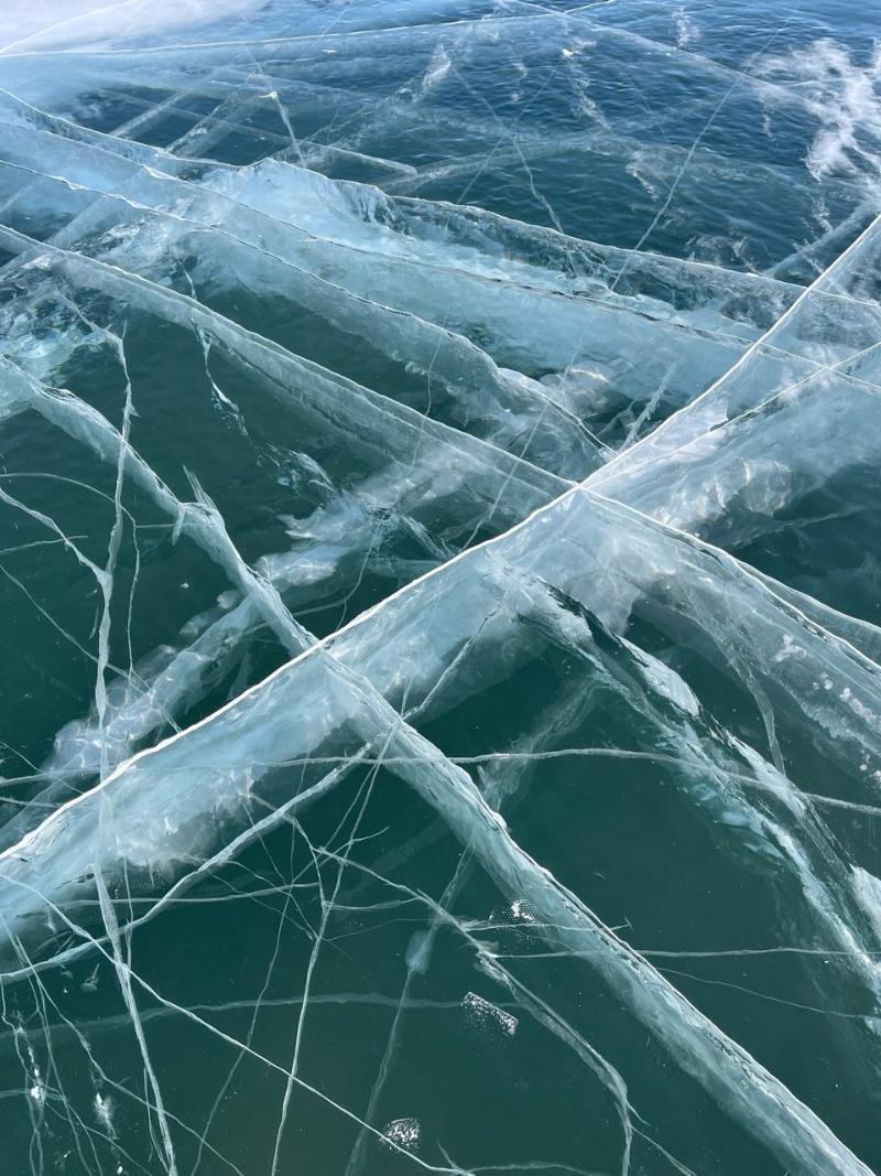 Дорога от берега до середины озера заняла около 20 минут. Раньше я думала, что лед специально отчищают от снега в определенных местах для туристов. Оказалось, что ветер справляется с этой задачей гораздо лучше. У моего коллеги Саши забилось сердечко от ощущения бескрайности воды — словно в бездну вглядываешься.