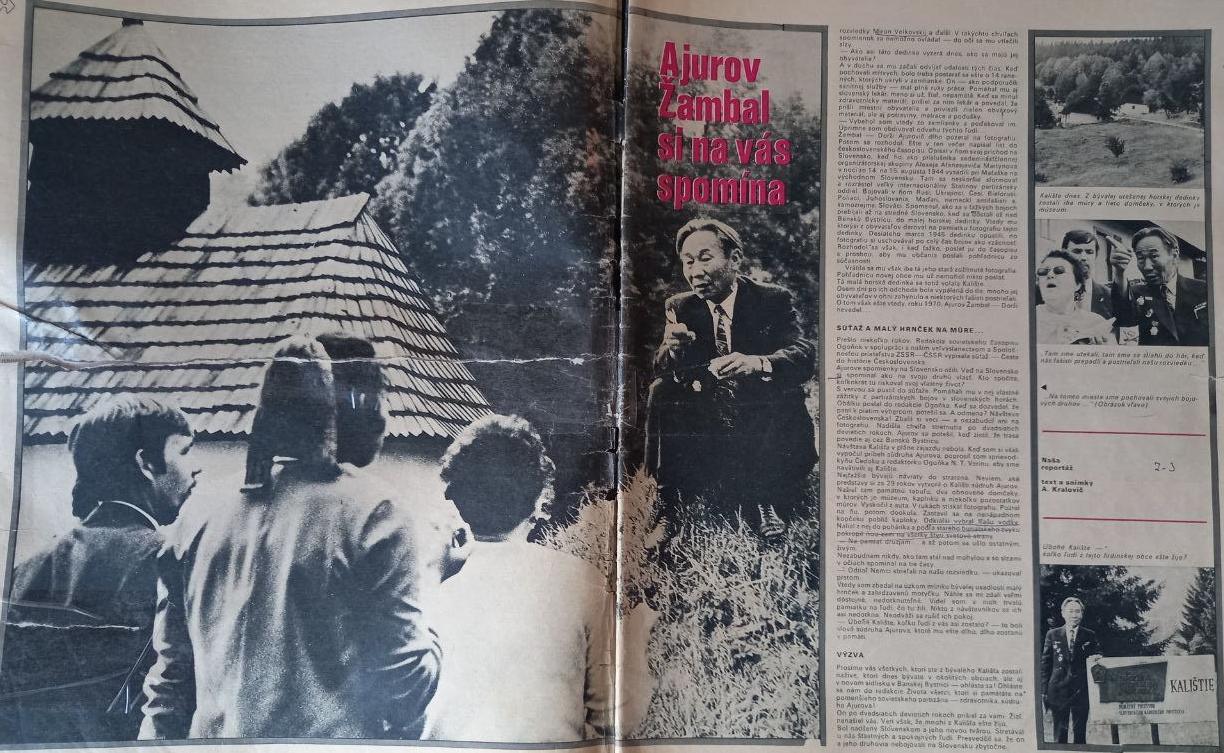 Конечно, во время поездки Аюров мечтал встретиться с боевыми соратниками. Такой наказ ему и Уткин давал, но встретиться ни с кем не удалось. Уже по приезде на родину Жамбалдоржи в село Агинское пришел пакет из ЧССР. А в нем журнал «Живот» с большим очерком об Аюрове, о его партизанской жизни. Очерк заканчивался призывом: «…Просим всех, кто жил в Калиште и остался в живых, кто сейчас находится в окрестностях или в новом районе Банской-Быстрицы, - отзовитесь! Сообщите редакции журнала «Живот», кто помнит советского партизана-доктора Аюрова! Через 30 лет он пришел к нам, но не нашел вас. Может быть, многие из Калиште живы. Новый образ жизни Словакии светел и прекрасен. Здесь живут счастливые и мирные люди. Не зря сражались он и его друзья за Словакию».