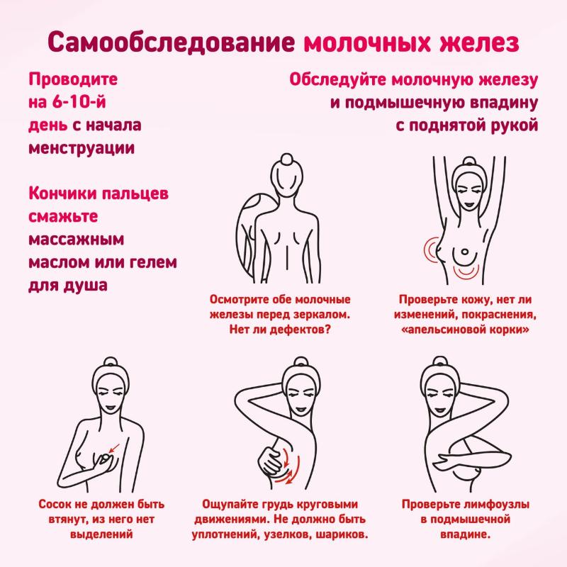 Начиная с 18–20 лет каждой женщине следует ежемесячно проводить самообследование молочных желез. Оптимальное время – 6–12-й день менструального цикла, а после наступления менопаузы – любой фиксированный день месяца.