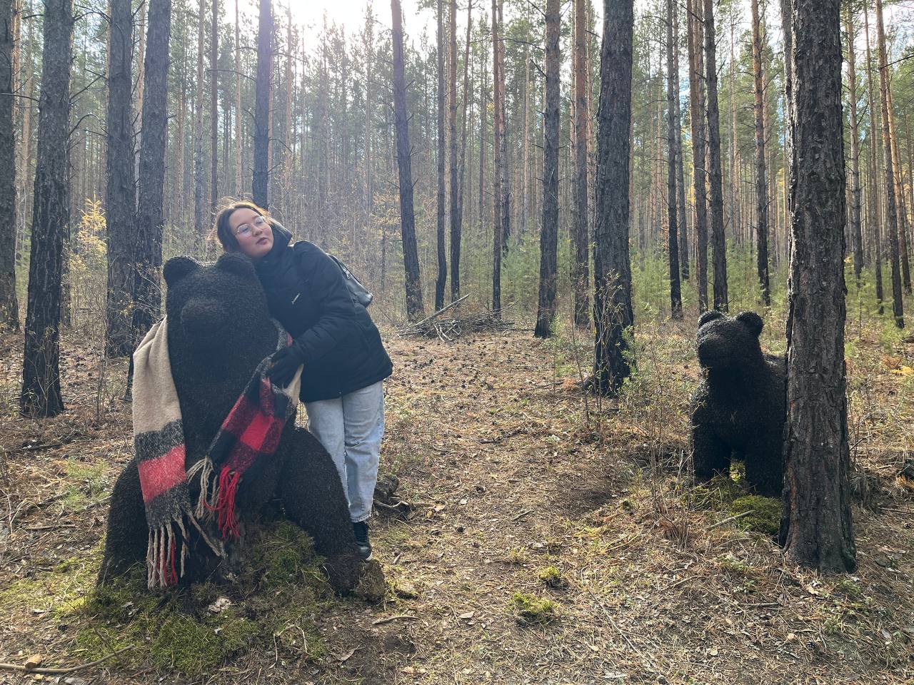 Эта тропа оказалось даже на столь небольшом участке самой насыщенной на неожиданные встречи. Первыми нас заметили медведи! Они притаились среди деревьев и неподвижно следили за прогуливающимися людьми. И мы тут же кинулись прямо к ним. Шерсть из коричневого газона и полное отсутствие агрессии – вот такие нынче медведи в городских лесах. По табличке мы догадались, что «зверей» обновленной тропе подарил комбинат по благоустройству Улан-Удэ. Устроили себе и мишкам небольшую фотосессию и отправились дальше искать сюрпризы. Неподалеку нас уже ждал еж с полной спиной грибов и ягод. Следом мы разглядели шалаш из мха и жердей.