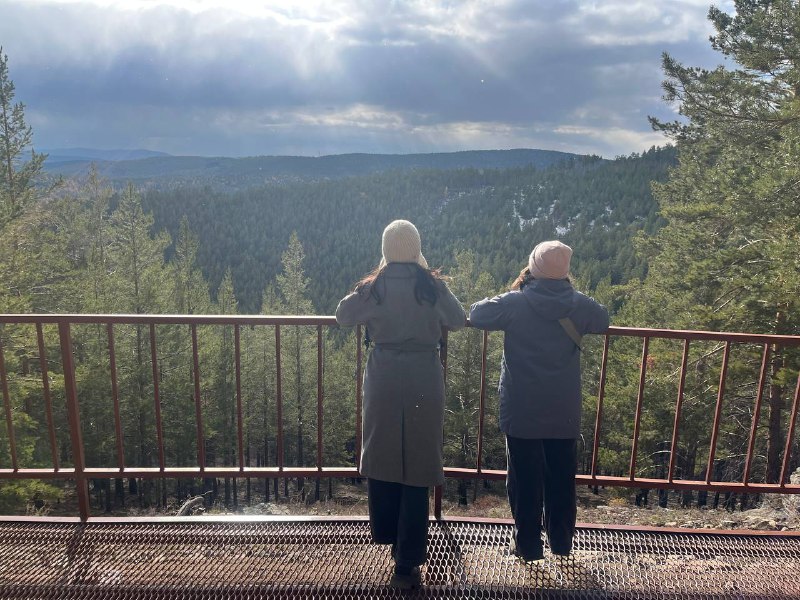 Впервые в жизни мне довелось увидеть солнечные часы. Они стоят на видном месте, так что вы их ни за что не пропустите. Это оказался подарок от «Городских маршрутов» и комитета по транспорту администрации города. Время показывают точное, мы проверили. На вершине горы нас ждал уже деревянный мишка – на этот раз от спецслужбы Улан-Удэ. Его мы тоже пообнимали и пофотографировали. А после сели на скамеечку неподалеку, чтобы насладиться видом и подкрепиться. Ведь это была лишь половина пути.