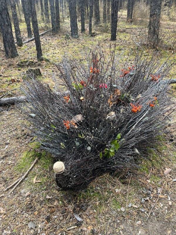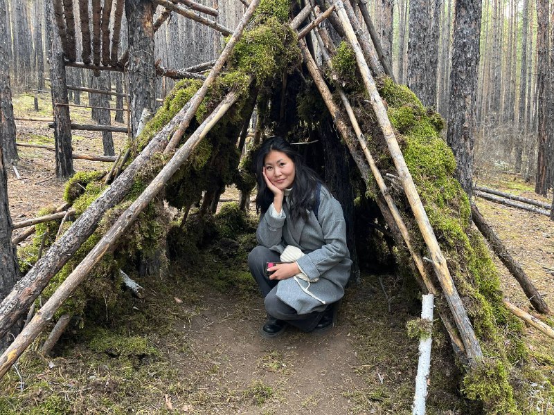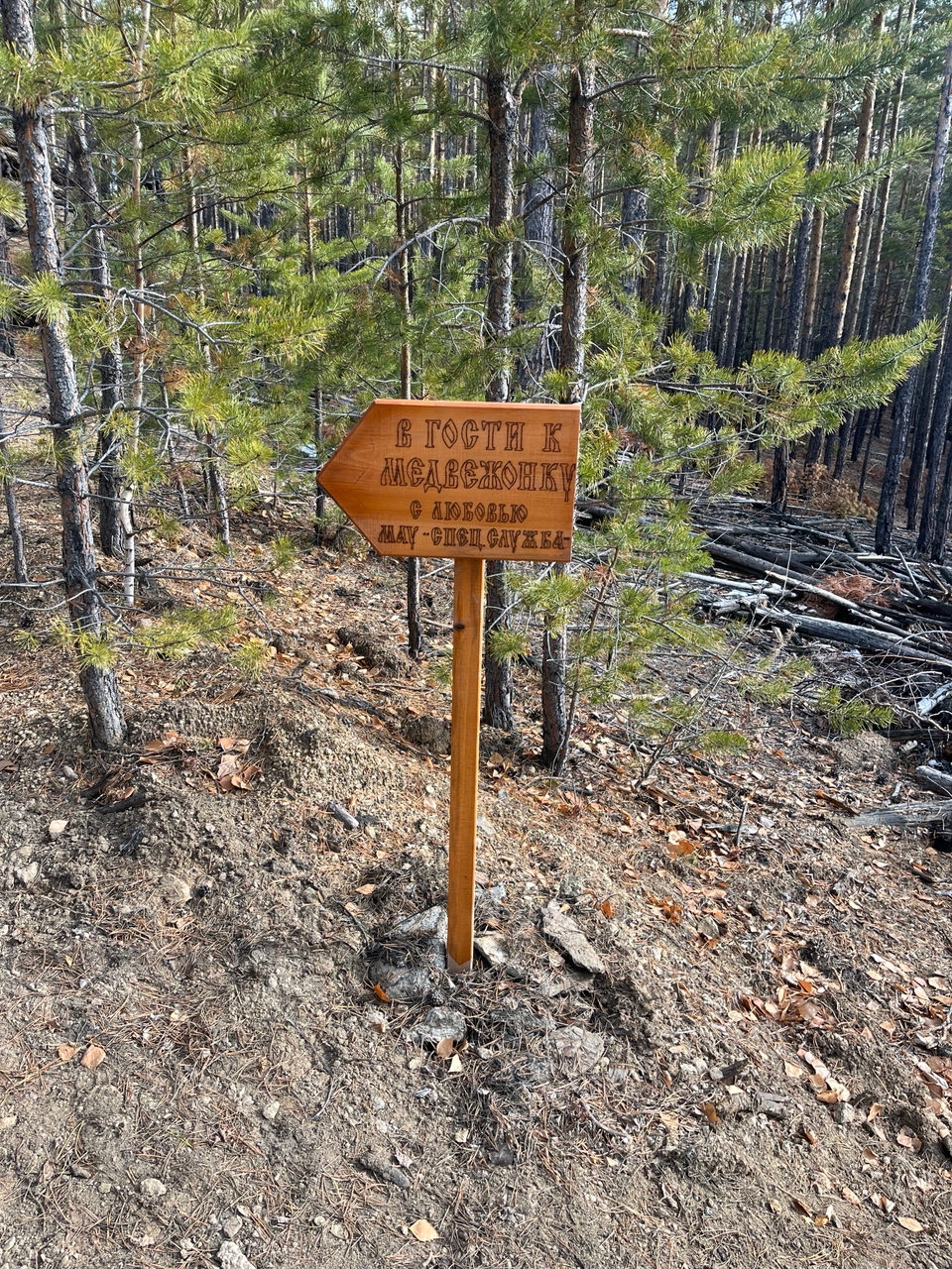 Эта тропа оказалось даже на столь небольшом участке самой насыщенной на неожиданные встречи. Первыми нас заметили медведи! Они притаились среди деревьев и неподвижно следили за прогуливающимися людьми. И мы тут же кинулись прямо к ним. Шерсть из коричневого газона и полное отсутствие агрессии – вот такие нынче медведи в городских лесах. По табличке мы догадались, что «зверей» обновленной тропе подарил комбинат по благоустройству Улан-Удэ. Устроили себе и мишкам небольшую фотосессию и отправились дальше искать сюрпризы. Неподалеку нас уже ждал еж с полной спиной грибов и ягод. Следом мы разглядели шалаш из мха и жердей.