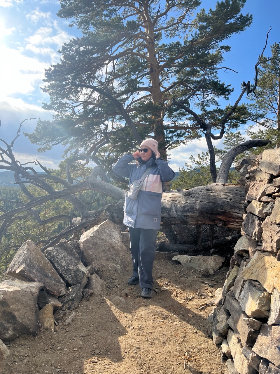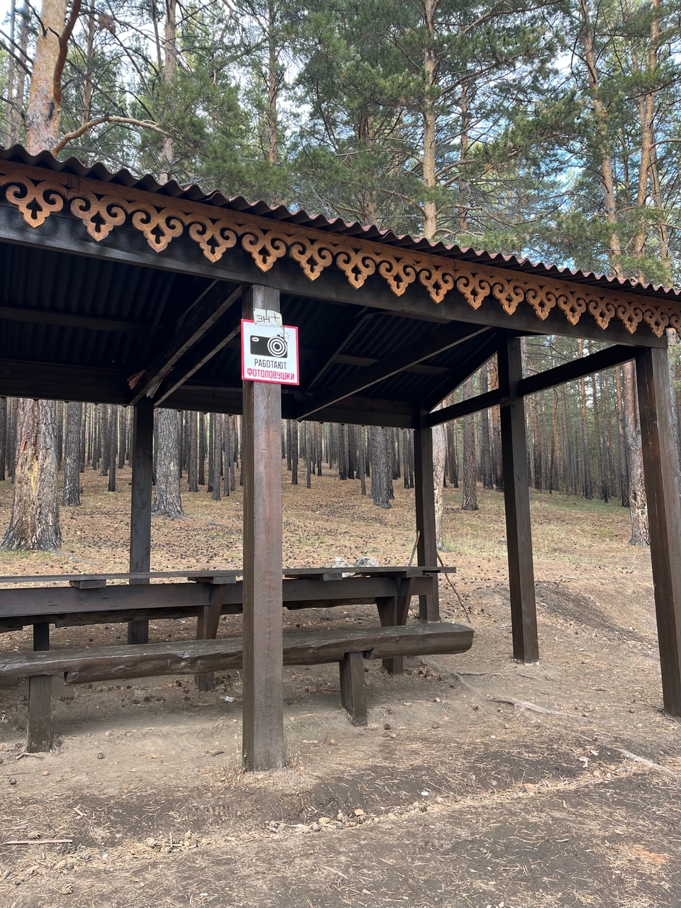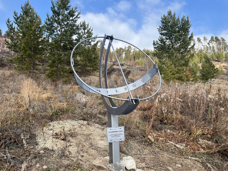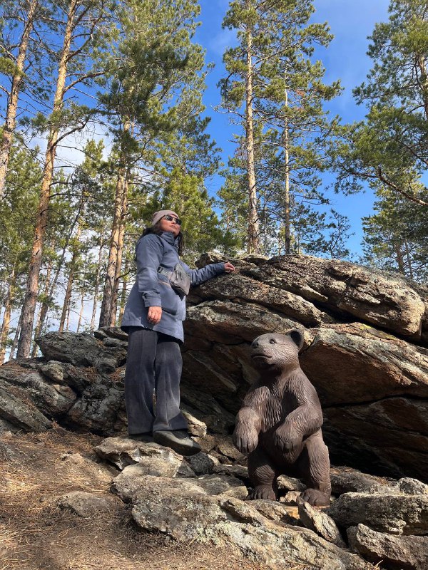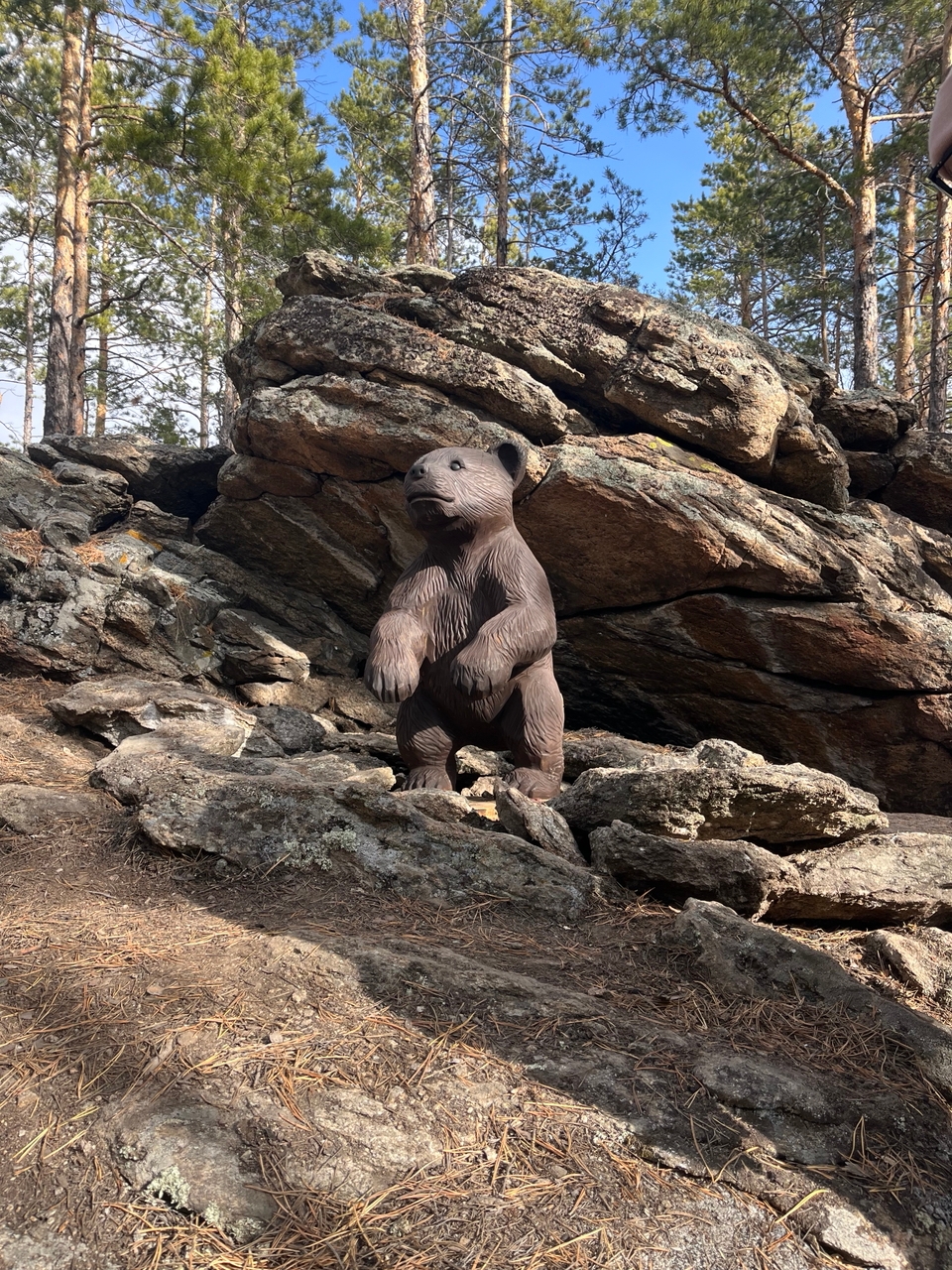 Впервые в жизни мне довелось увидеть солнечные часы. Они стоят на видном месте, так что вы их ни за что не пропустите. Это оказался подарок от «Городских маршрутов» и комитета по транспорту администрации города. Время показывают точное, мы проверили. На вершине горы нас ждал уже деревянный мишка – на этот раз от спецслужбы Улан-Удэ. Его мы тоже пообнимали и пофотографировали. А после сели на скамеечку неподалеку, чтобы насладиться видом и подкрепиться. Ведь это была лишь половина пути.