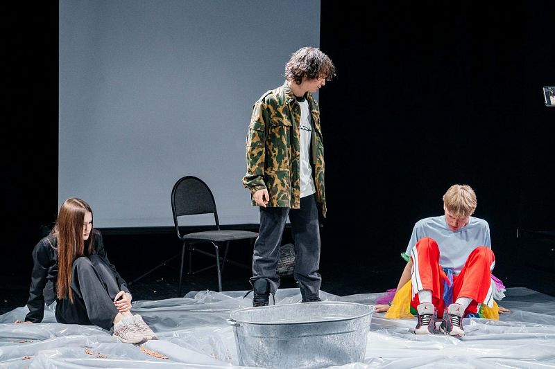Сценическое пространство напоминает место карательной акции — голый пол, полиэтилен, резкий свет и видеокамера на штативе усиливают эмоциональное напряжение.