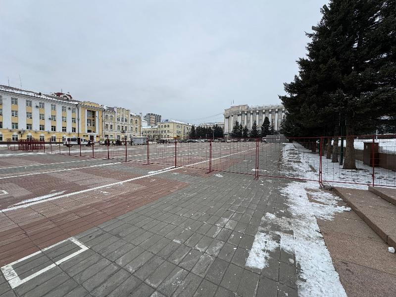На главной площади Улан-Удэ приступают к работам по подготовке Новогоднего городка. На время строительства территорию ограждают сеткой для безопасности горожан.