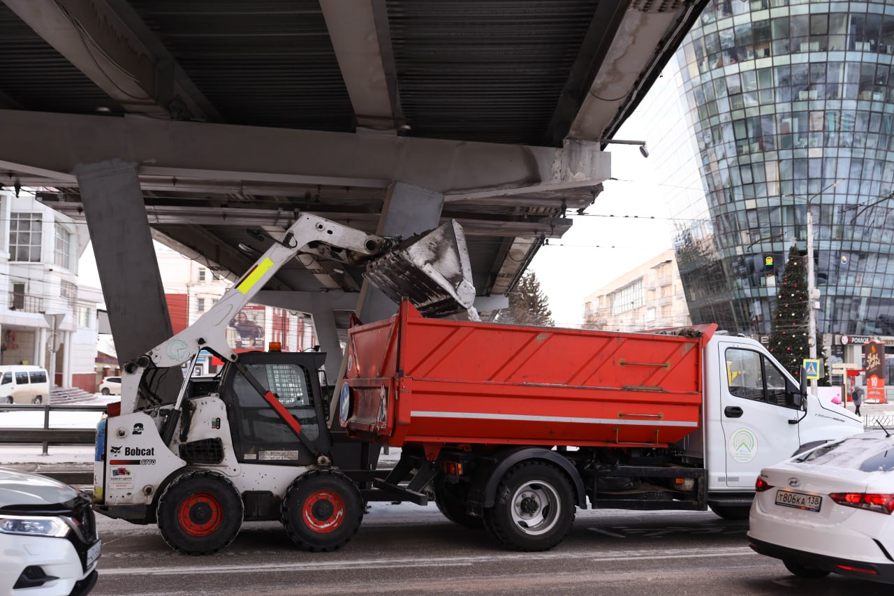 Сегодня в течение дня уборщики территорий с помощью мини-погрузчиков и самосвалов вывозят собранный ночью снег. Спецтехника сначала расчищает участок грейдером, затем трактор с щёткой и отвалом собирает остатки снега, формируя единый снежный вал вдоль дороги. После этого снегопогрузчики транспортируют снег в грузовые автомобили. Основная работа идет ночью, чтобы не мешать движению транспорта. Днем продолжается ручная и механизированная уборка тротуаров, лестниц и остановок от снега.