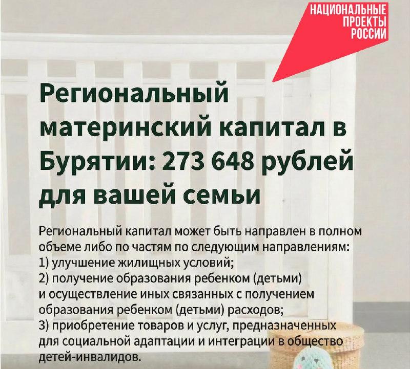 С начала 2025 года региональным маткапиталом воспользовалась 1131 семья на общую сумму 264,5 млн рублей, - отметила министр социальной защиты населения Бурятии Татьяна Быкова. - На детей, родившихся после 1 января 2020 года - в размере почти 274 тысячи рублей (30% от суммы федерального маткапитала). Подробнее о выплате можно узнать на сайте https://дети03.рф/