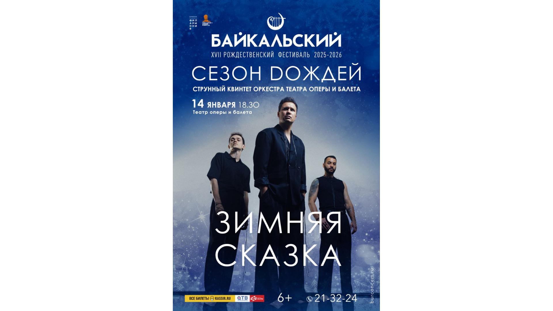 А завершится фестиваль 14 января концертом «Сезона дождей». Группа будет играть свои песни в сопровождении струнного квинтета музыкантов оркестра Бурятского театра оперы и балета. В программе концерта под названием «Зимняя сказка» прозвучат как уже известные широкой публике авторские песни группы, так и новые композиции. Также музыканты исполнят знаменитые романсы «Ах ты, душечка» и «Скажите девушки подружке вашей».