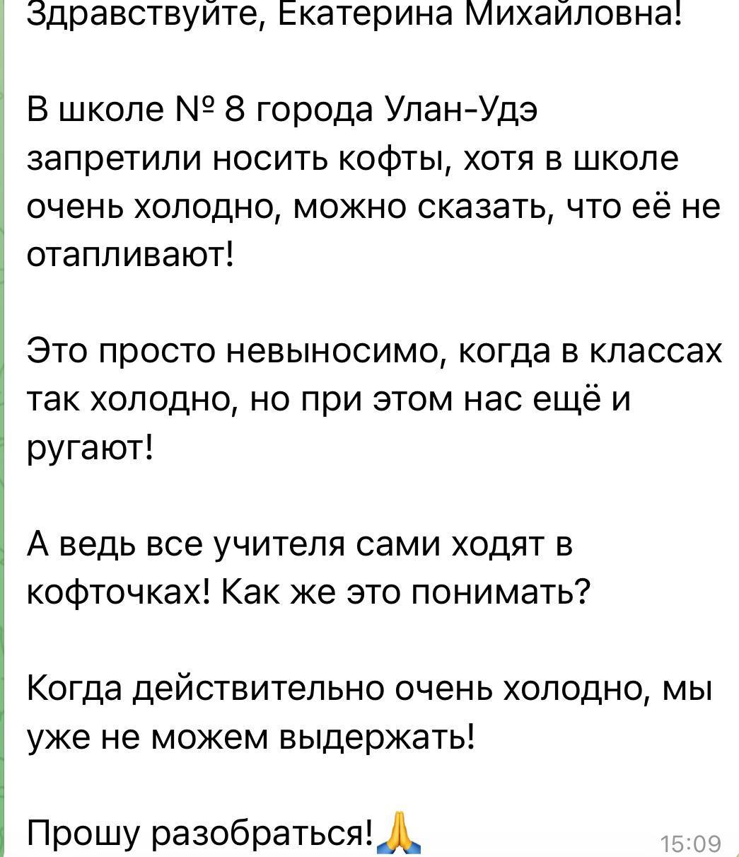 В Улан-Удэ учащимся запретили носить кофты в школе, после чего они пожаловались Екатерине Мизулиной.