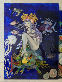 С той же целью творит и другая участница выставки – художница Туяна Бадмажапова. Она создает картины в пастели, акриле, масле, графике и карандаше, а также витражи, искусно сочетая техники. Героями ее полотен становятся как реальные люди, так и собирательные образы из прошлого, а в творчестве она обращается к древним бурятским легендам и мифам, переосмысливая их через современные смешанные техники.