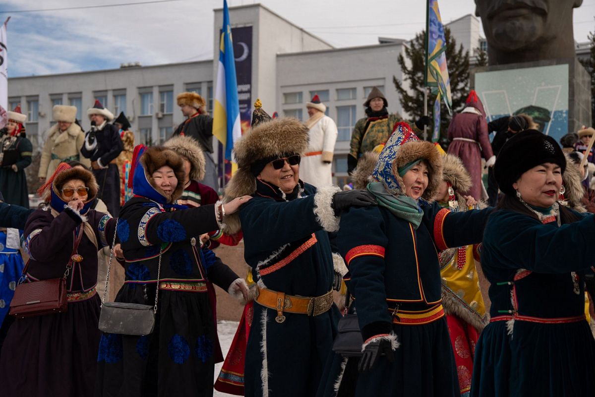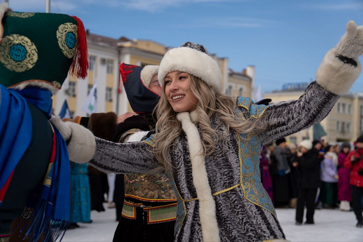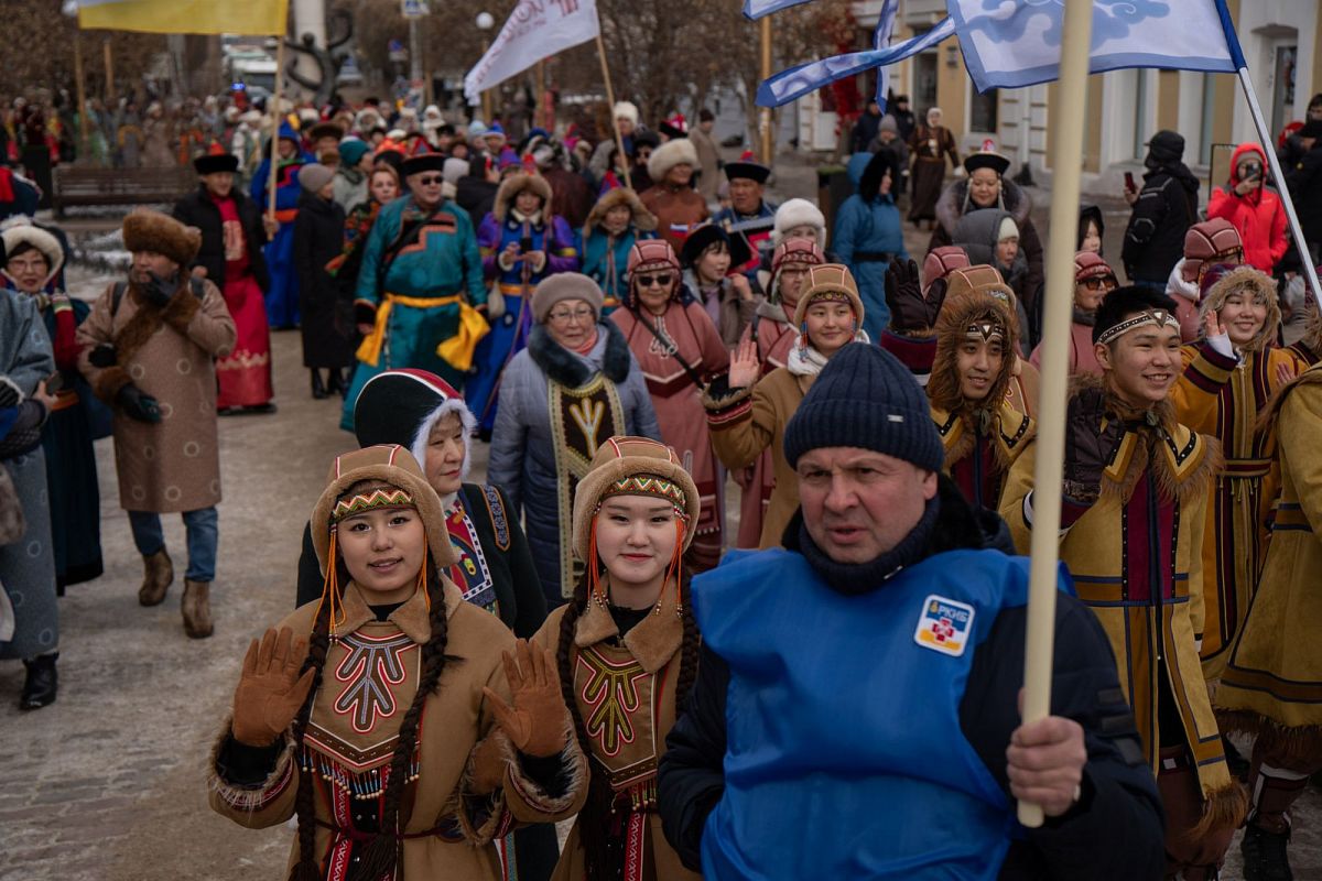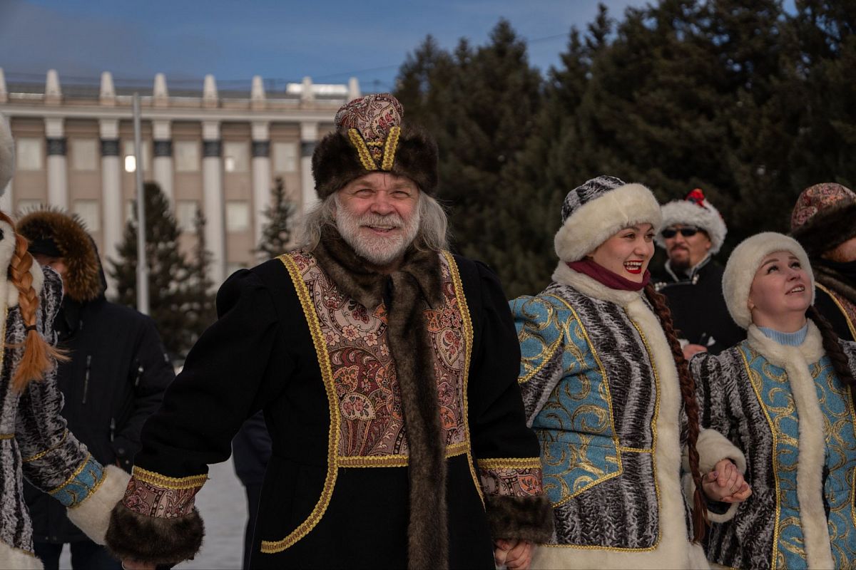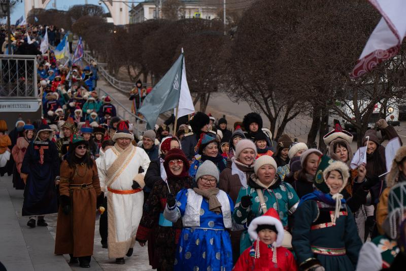 Сотни людей в изысканных национальных костюмах прошли по главной улице города, чтобы поучаствовать в популярном шествии. Дабы не замёрзнуть, более учатники станцевали массовый ёхор. Начался он с площади Советов, перетек вниз к Арбату, где и остановился.