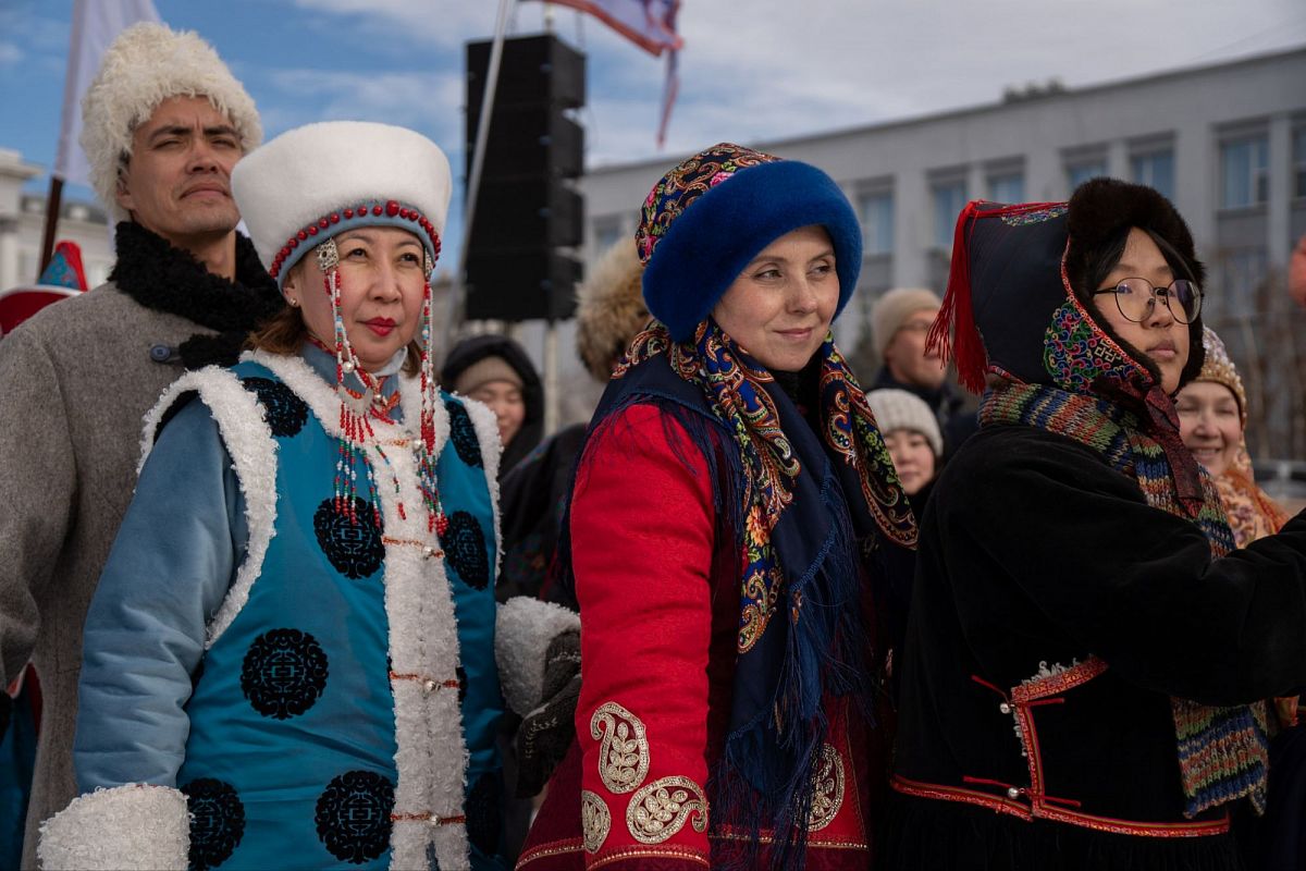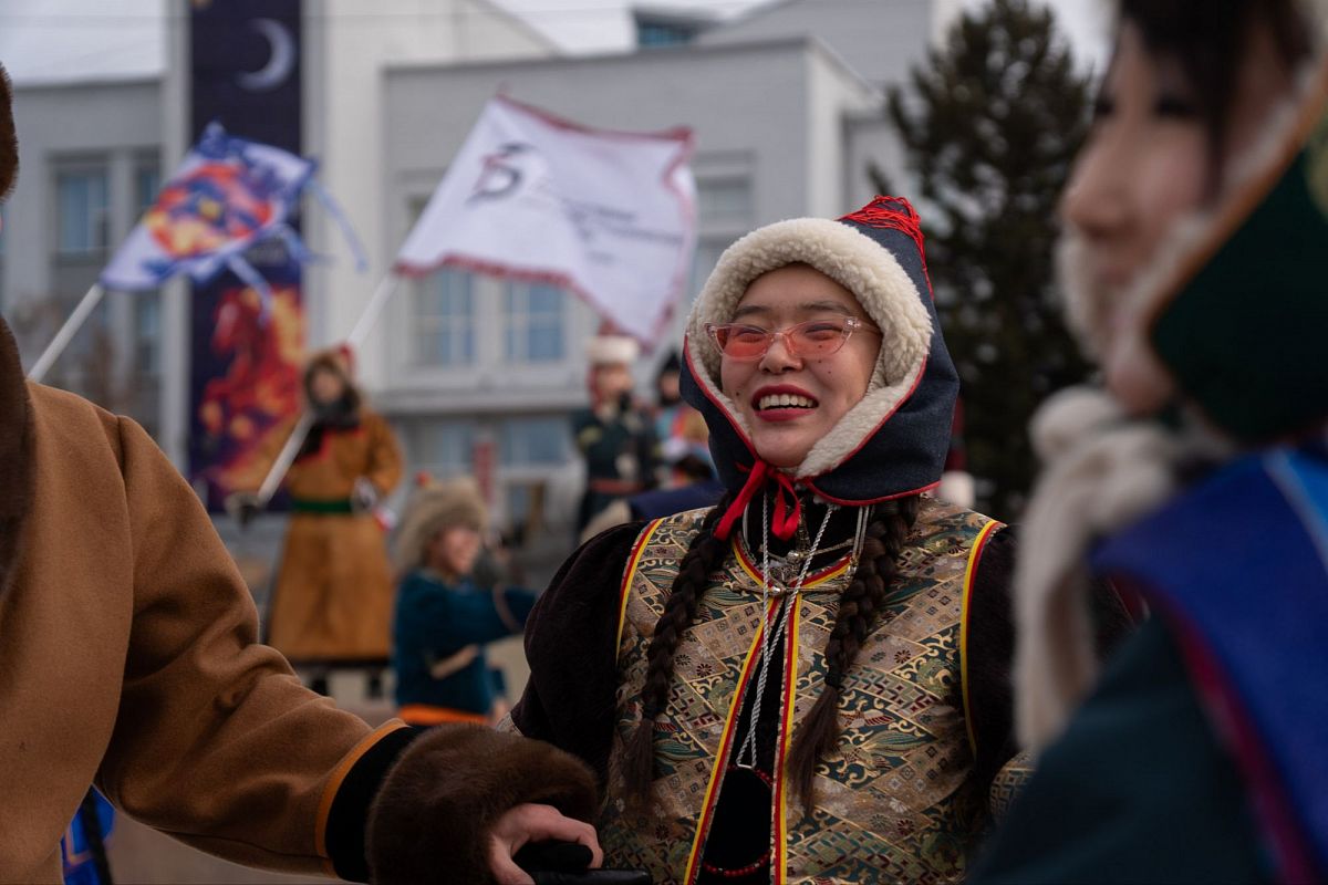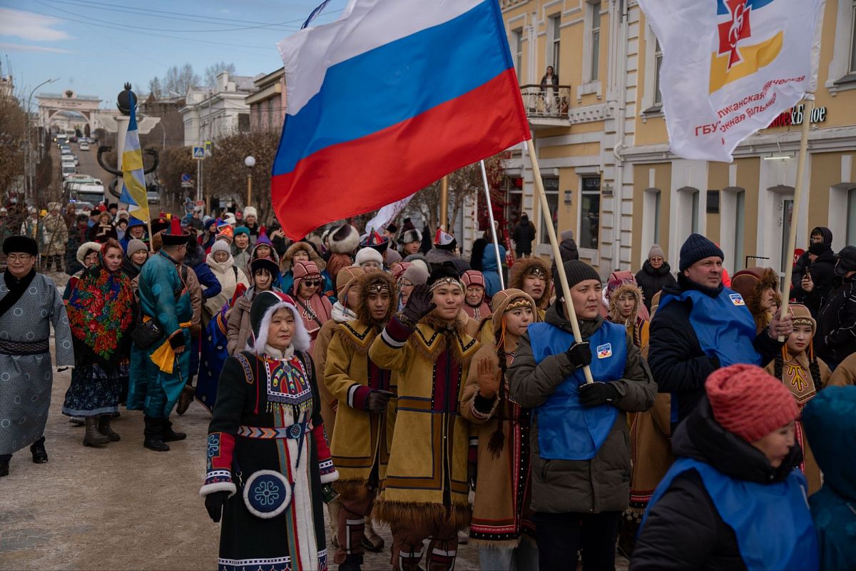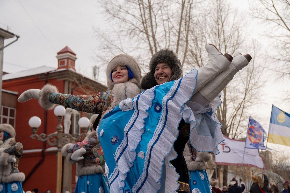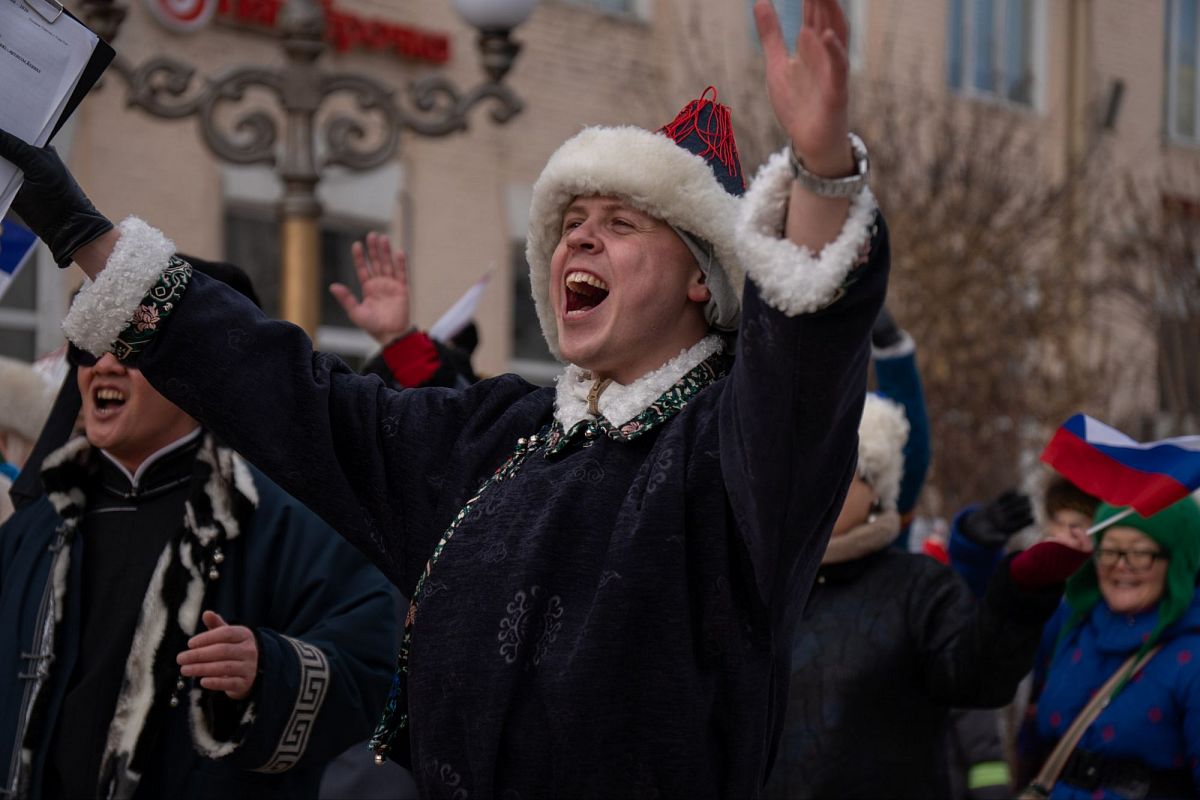 Сотни людей в изысканных национальных костюмах прошли по главной улице города, чтобы поучаствовать в популярном шествии. Дабы не замёрзнуть, более учатники станцевали массовый ёхор. Начался он с площади Советов, перетек вниз к Арбату, где и остановился.