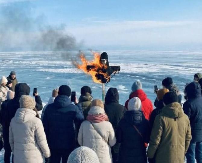 В последний день Масленицы чучело с лицом известного исполнителя Shaman'а сожгли на Байкале после его перформанса с облизыванием льда озера.