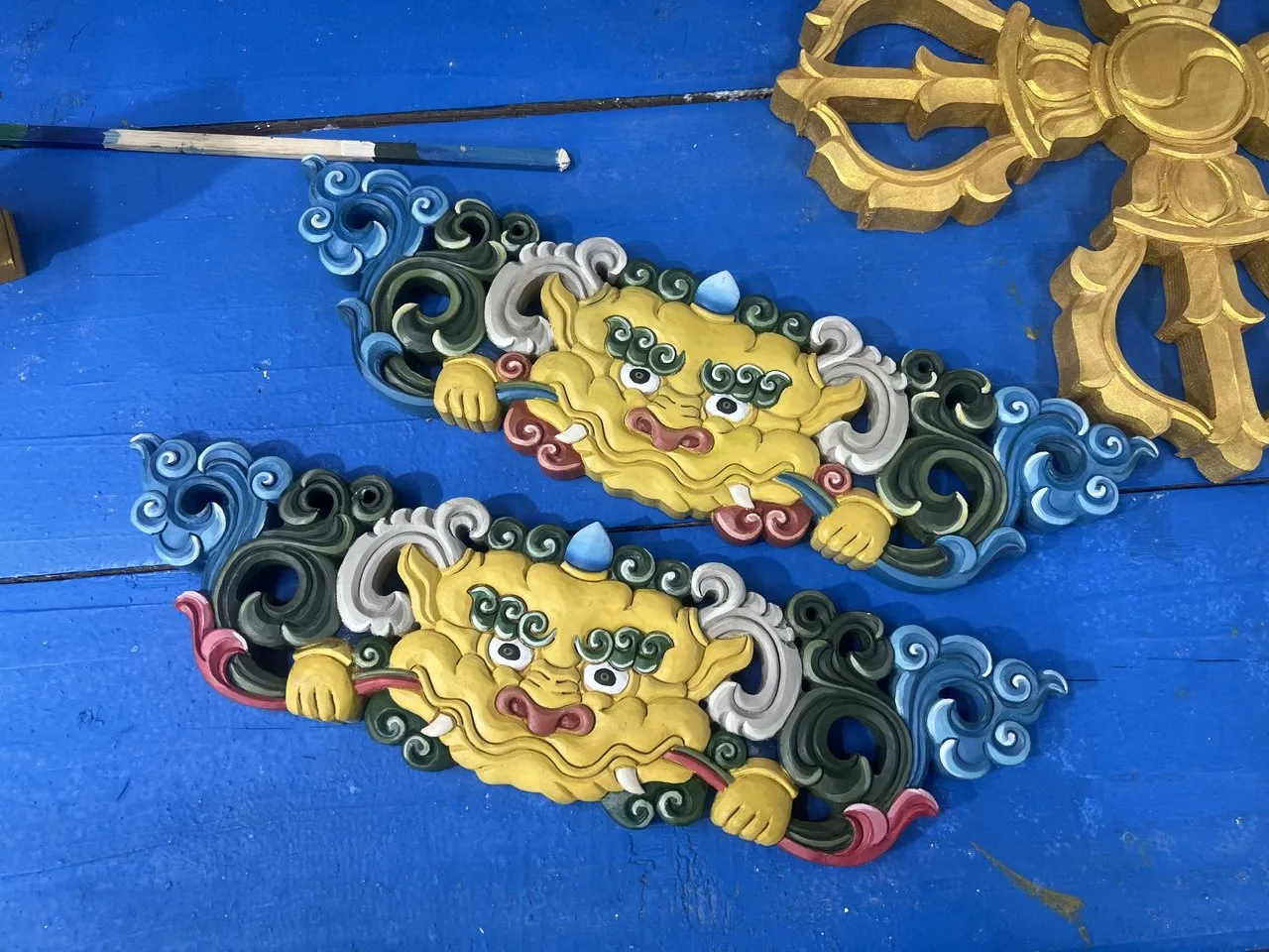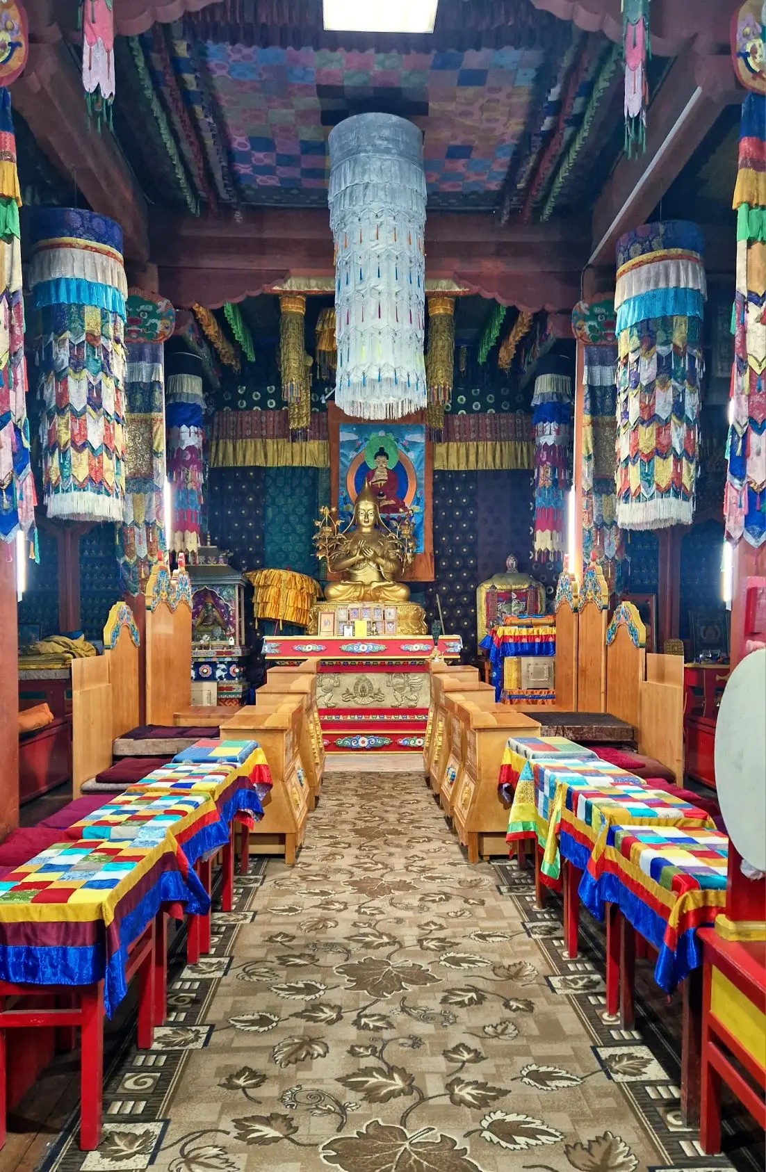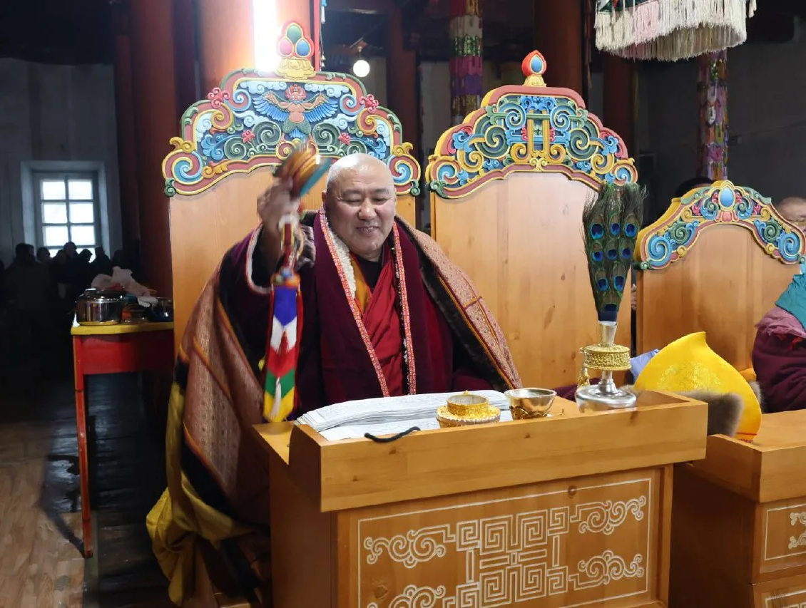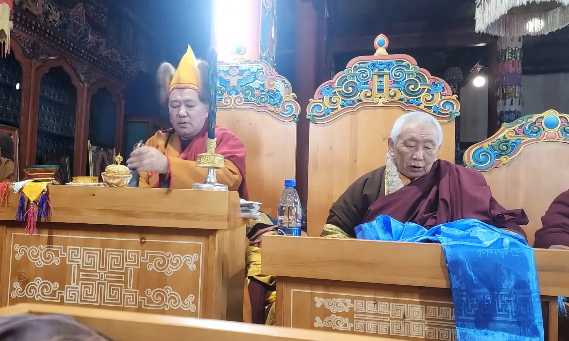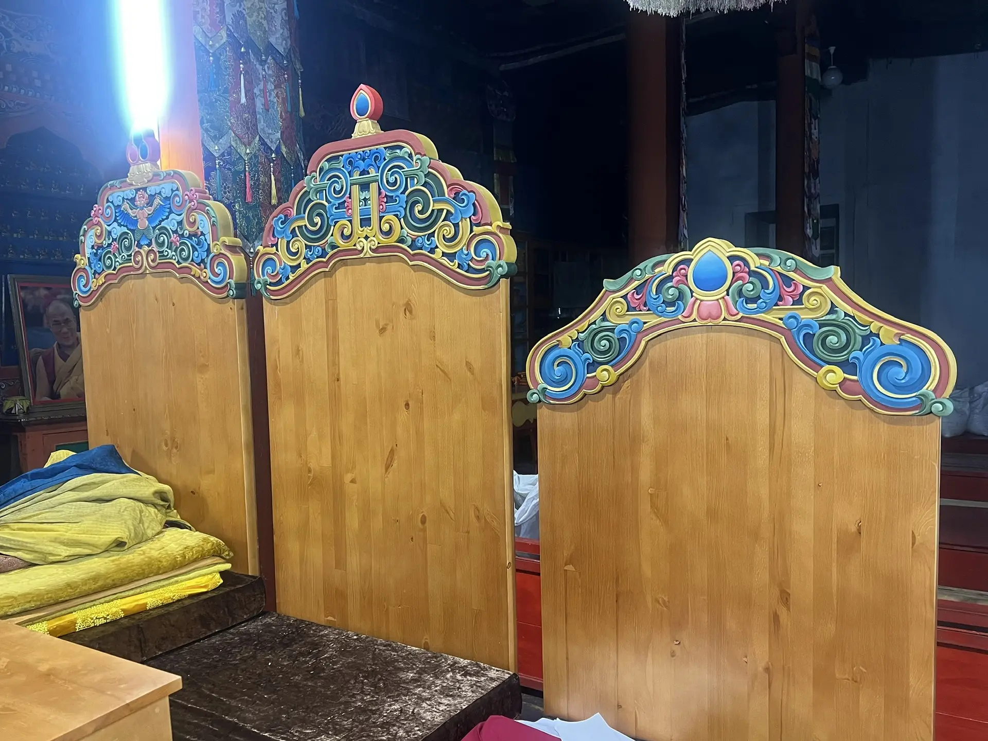 До наступления восточного Нового года мастер установил в храме декоративные резные элементы на сиденья и столы для лам. Немало работы ещё предстоит.
