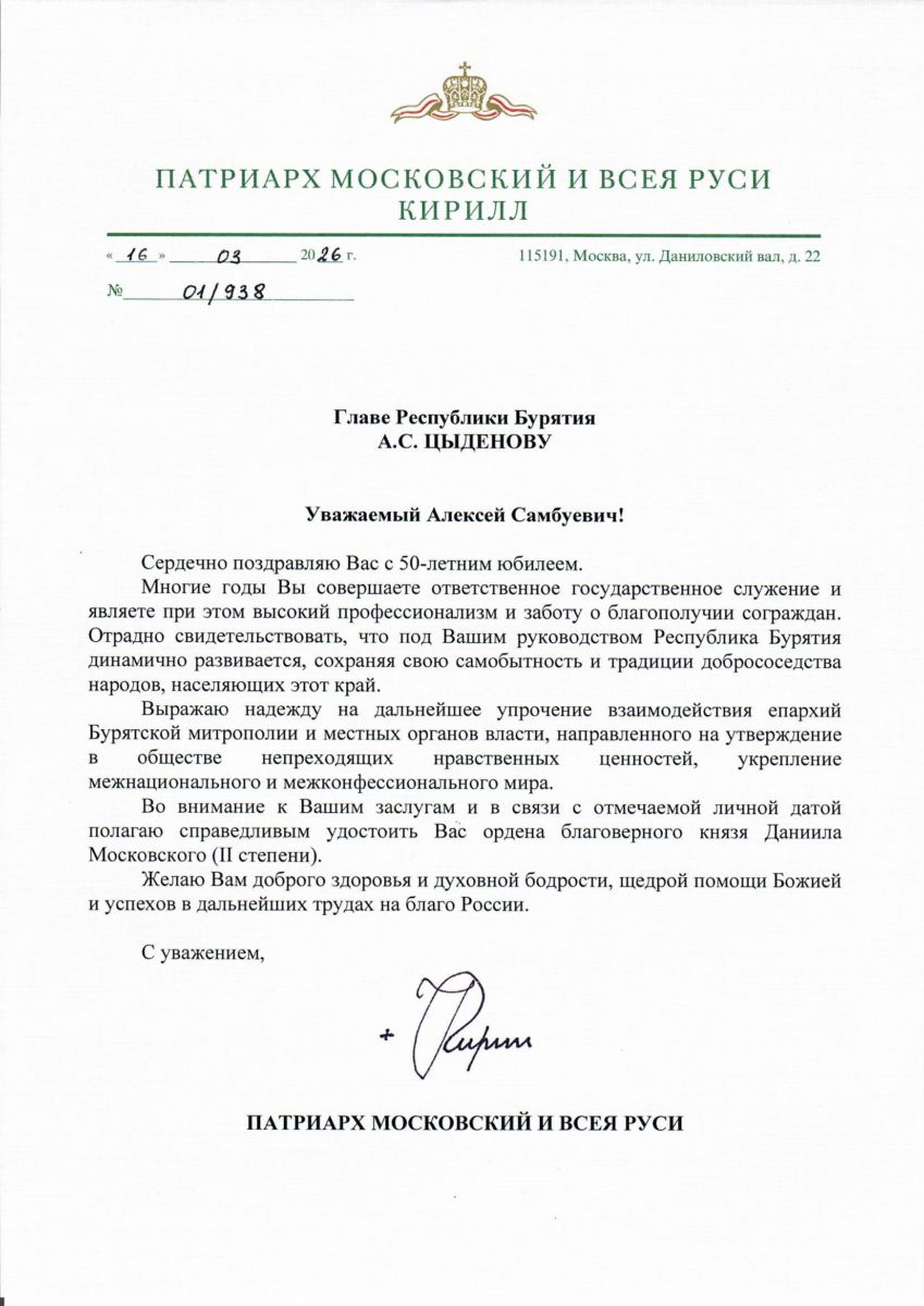 Патриарх Кирилл считает, что глава Бурятии достоин награды – ордена благоверного князя Даниила Московского IIстепени.