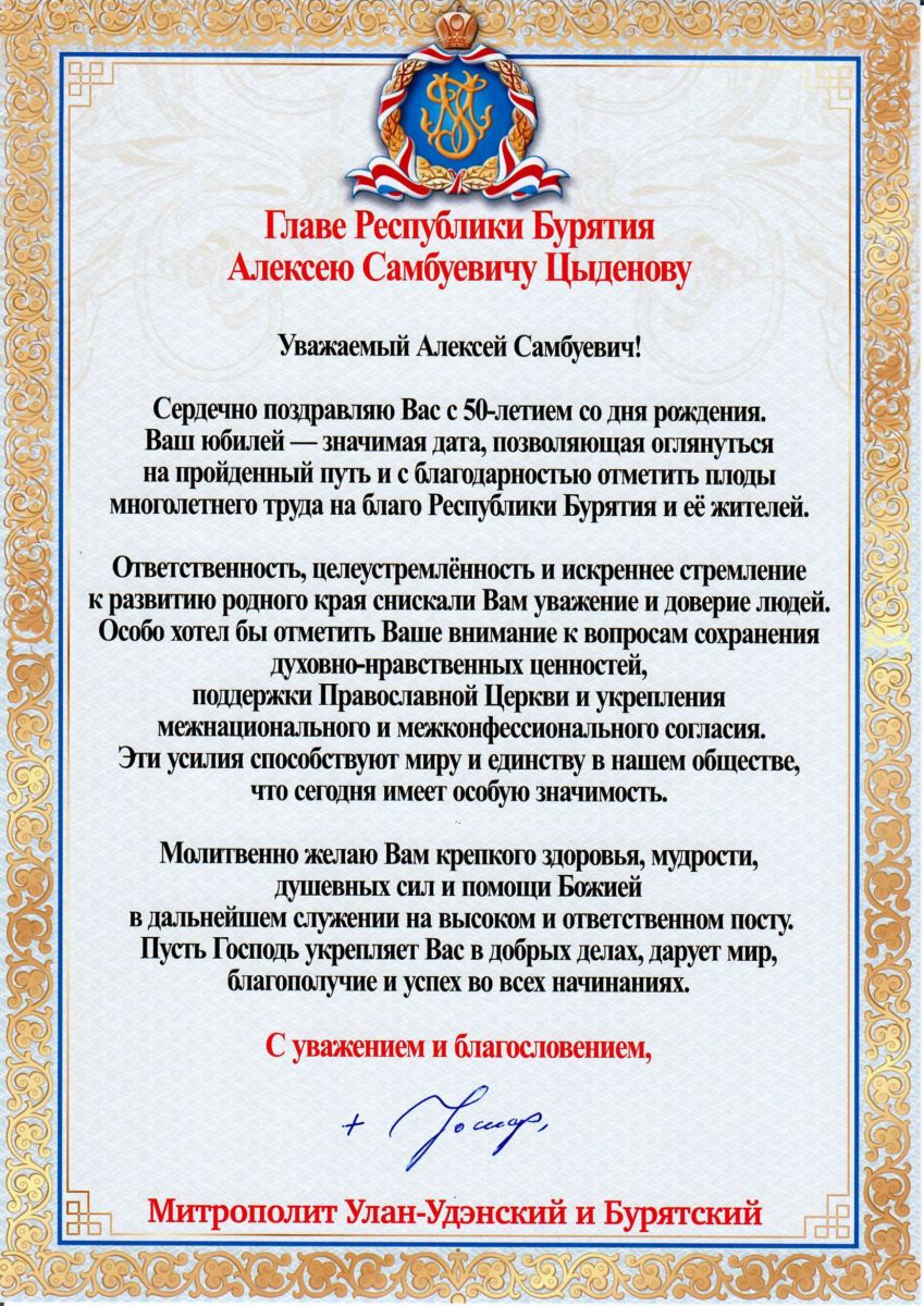 Митрополит Улан-Удэнский и Бурятский Иосиф также поздравил Алексея Цыденова с 50-летним юбилеем.