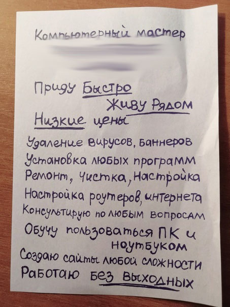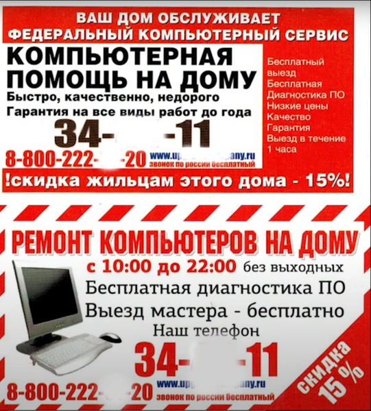 Наверное, каждый, кто живет в многоквартирном жилом доме, видел в своем почтовом ящике листовку, на которой от руки написано (на самом деле напечатано на цветном принтере) про ремонт компьютеров, цифровой и бытовой техники с выездом на дом и приемом заявок без выходных.