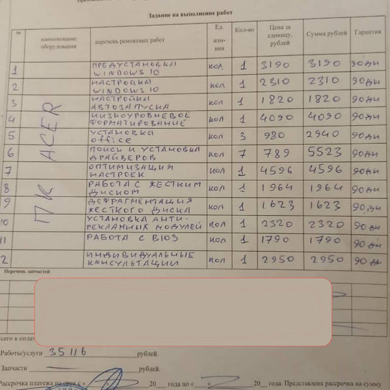 Чтобы понять, как формируются подобные суммы, достаточно взглянуть на реальные чеки, которые получают клиенты после визита таких мастеров. Например, в одном из случаев за установку Windows, офисных программ и нескольких приложений человеку выставили счёт более чем на 35 тысяч рублей. В перечне работ значились десятки пунктов с техническими названиями, хотя многие из этих действий либо дублировали друг друга, либо выполняются автоматически при установке системы.
